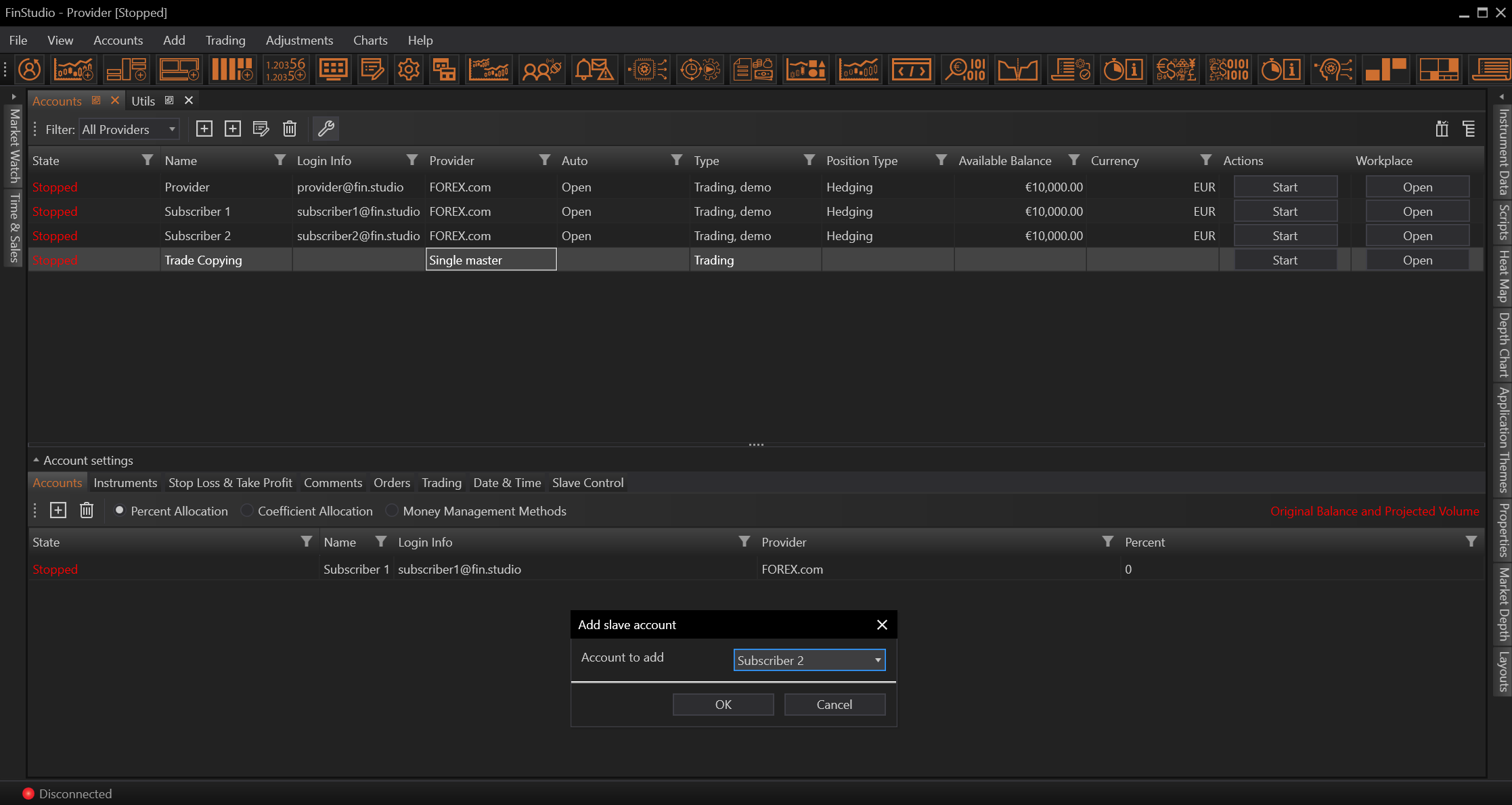 After all subscribers are added we need to select allocation or money management method and set it's parameters.