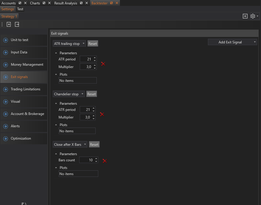 Developed exit signal models can be used as strategy parameters in Strategy Runner and Backtester as a part of exit signal collection.