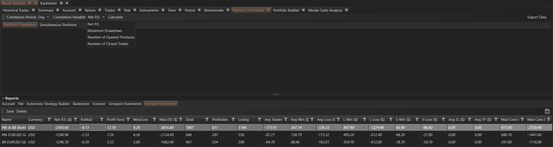 The Reports Correlation tab within the Result Analysis module allows users to analyze how different reports correlate with each other and determine the number of overlapping trades in the reports. The main purpose of this module is to facilitate the analysis of a portfolio of reports.