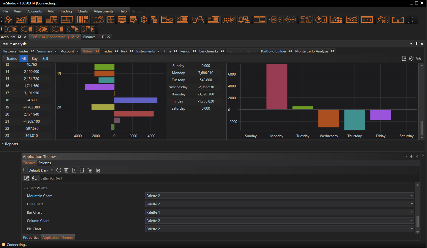 The Chart Palette properties section within FinStudio's Application Themes module enables users to customize and apply specific color palettes to different types of charts used throughout the platform. Properly selected palettes can enhance the visual impact of charts by ensuring that colors are optimally chosen for readability, aesthetic appeal, and data representation clarity.