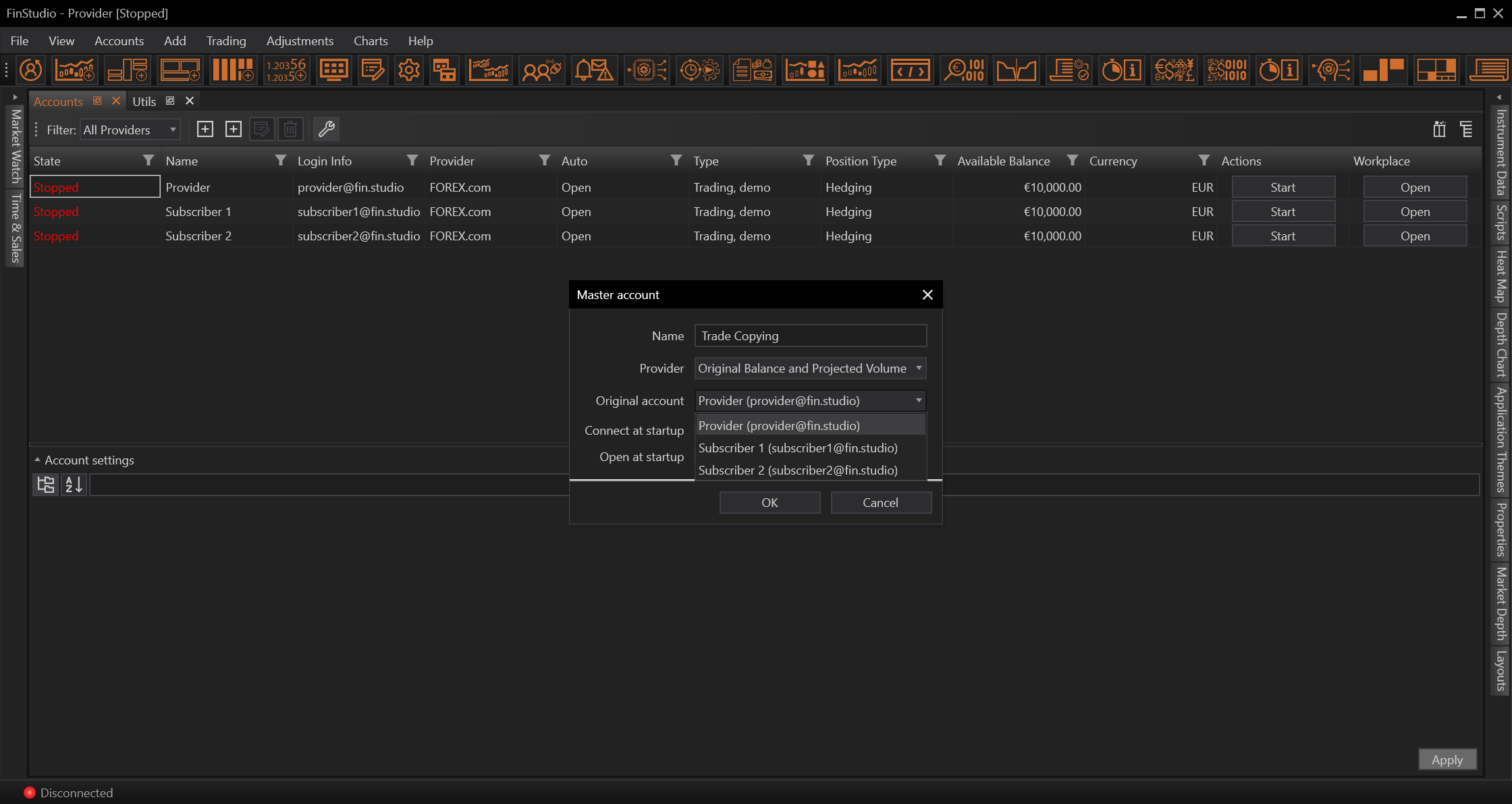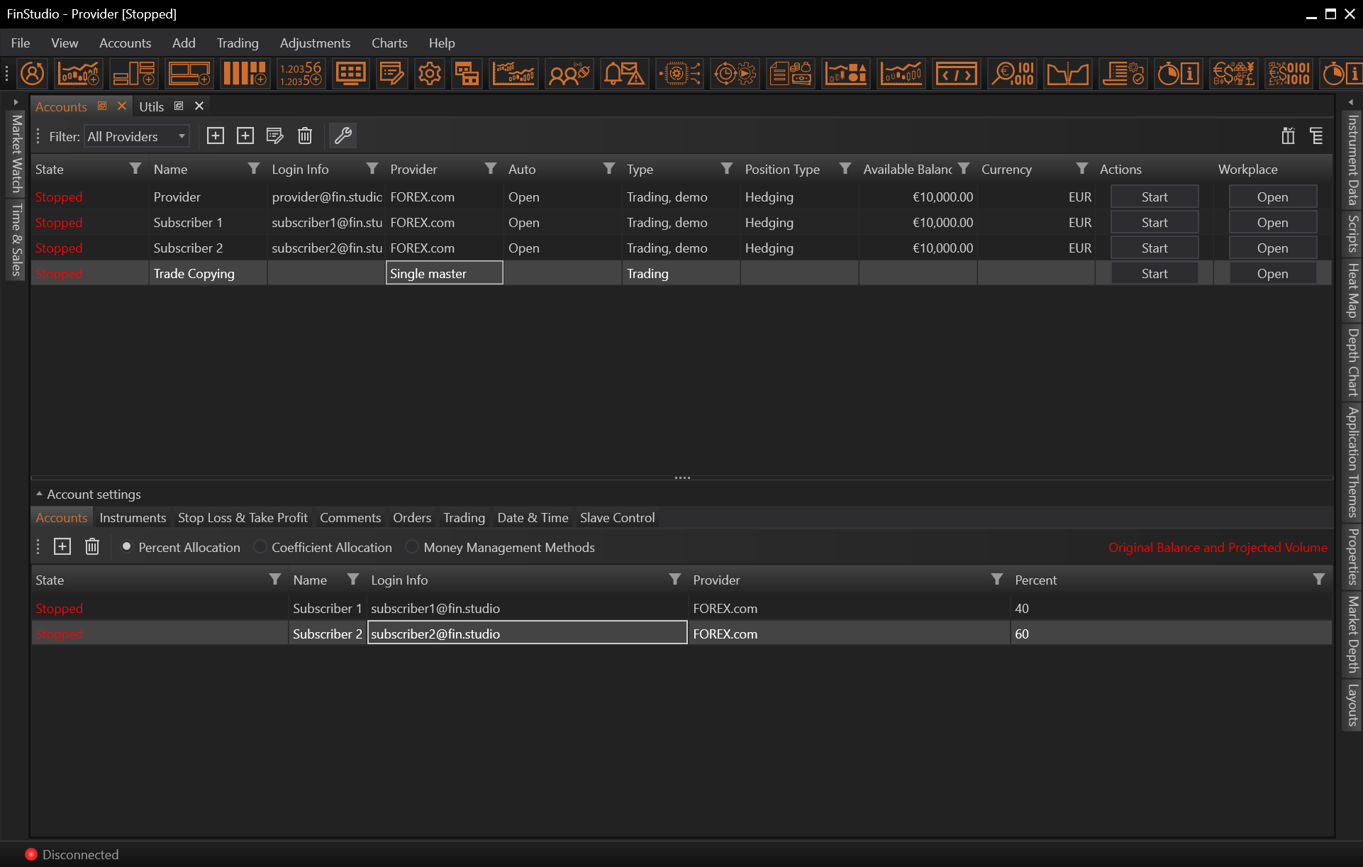 After all subscribers are added we need to select allocation or money management method and set it's parameters.