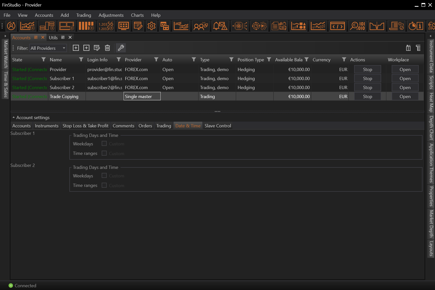 This will copy trades from provider's account to subscriber's account only during selected Weekdays or Time ranges.