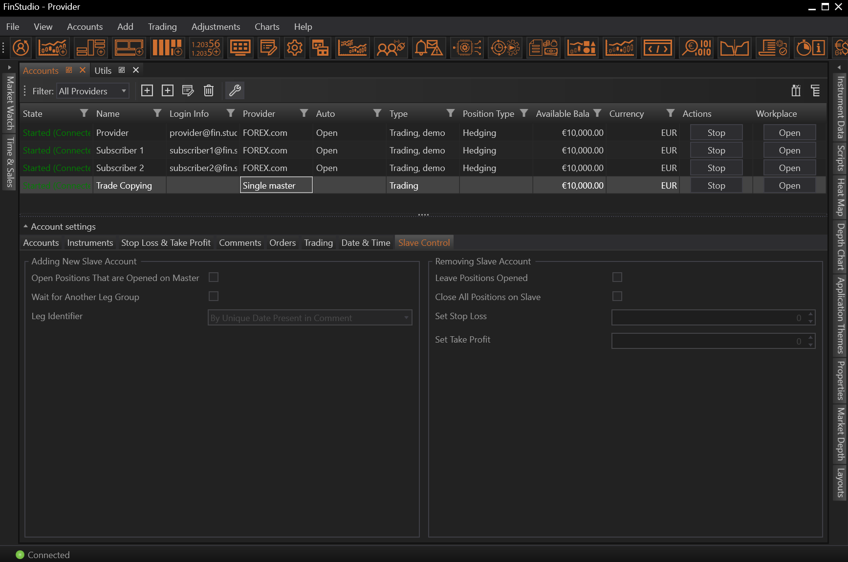 If we add a new subscriber's account it will open all positions that are opened on the provider's account (for current market price) and also keep opening all further trades.