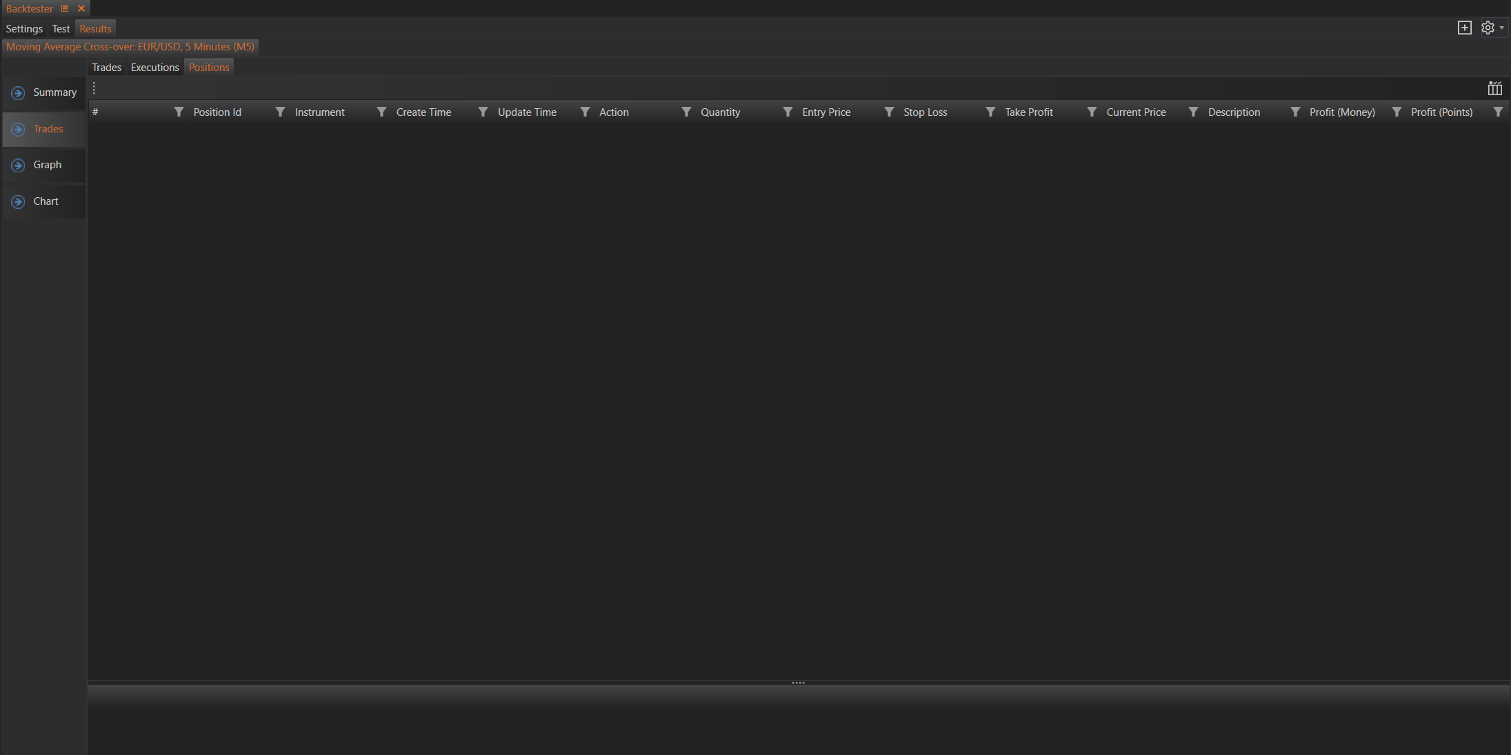 The Trades section in the Backtester Results tab provides a detailed breakdown of all trading activities during the backtest period. It is divided into three subsections: Trades, Executions, and Positions.