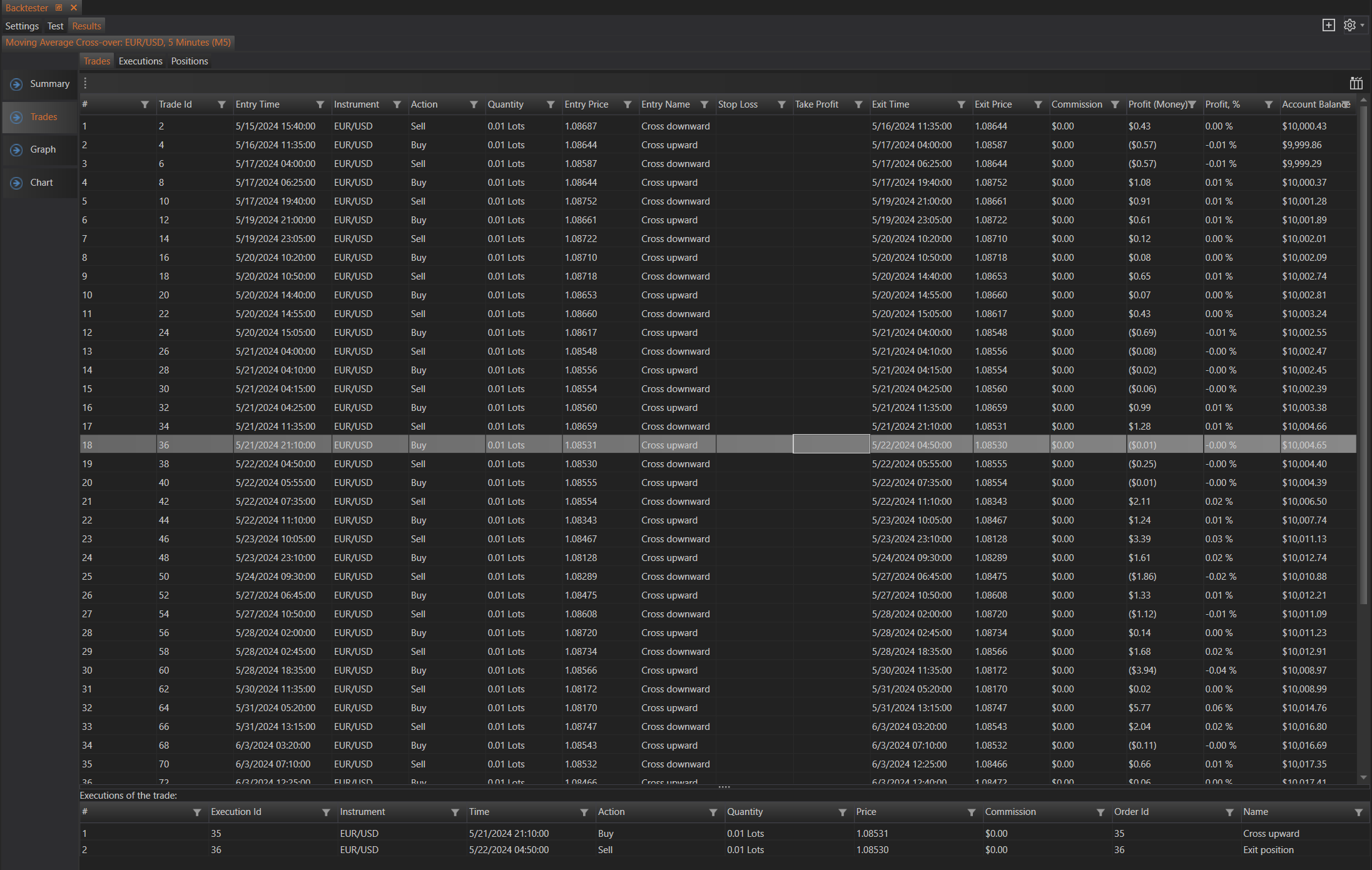 - Entry Name: The reason or strategy signal that triggered the entry (e.g., Cross upward, Cross downward).