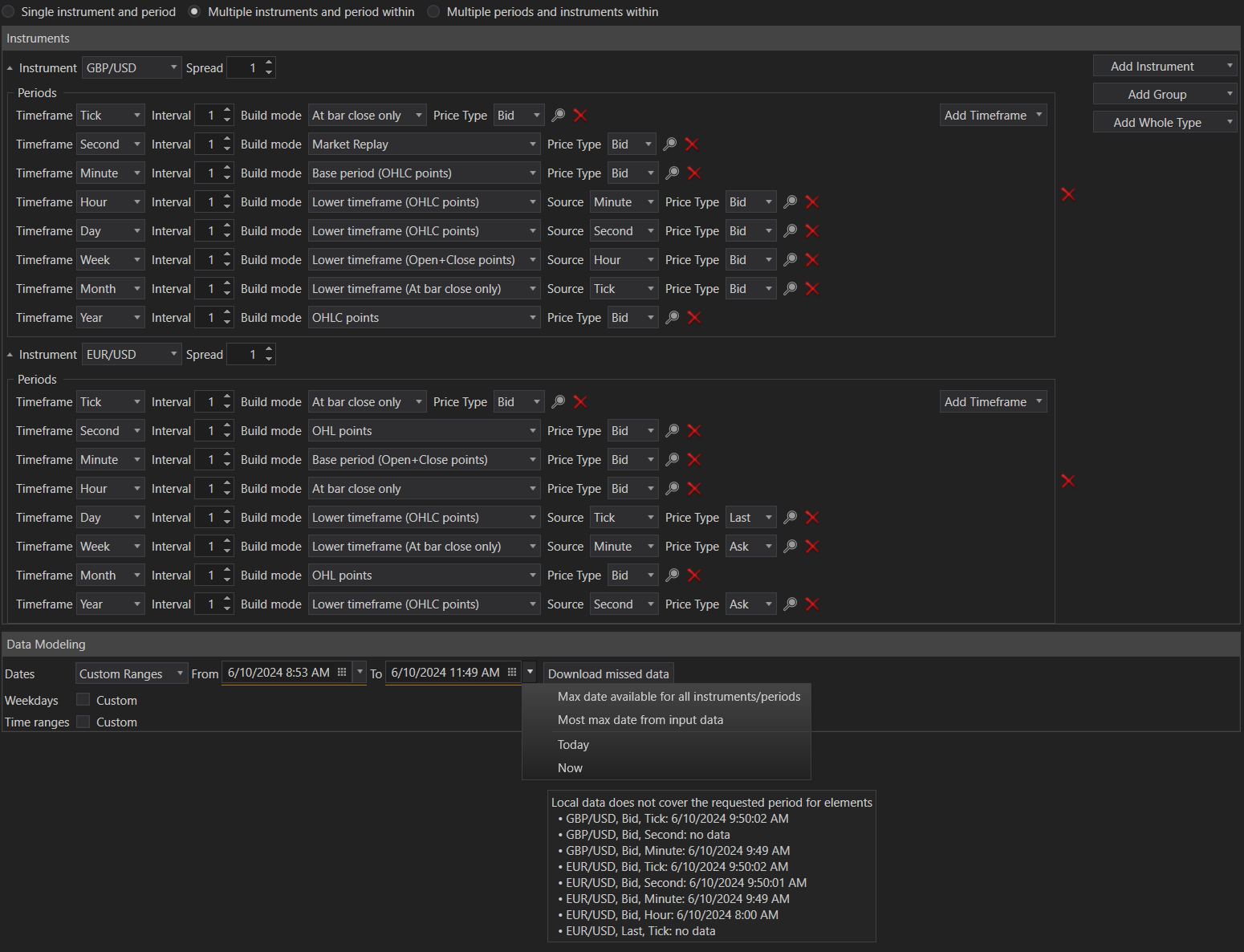 - Max Date Available for All Instruments/Periods: The latest date for which data is available across all selected instruments and periods.