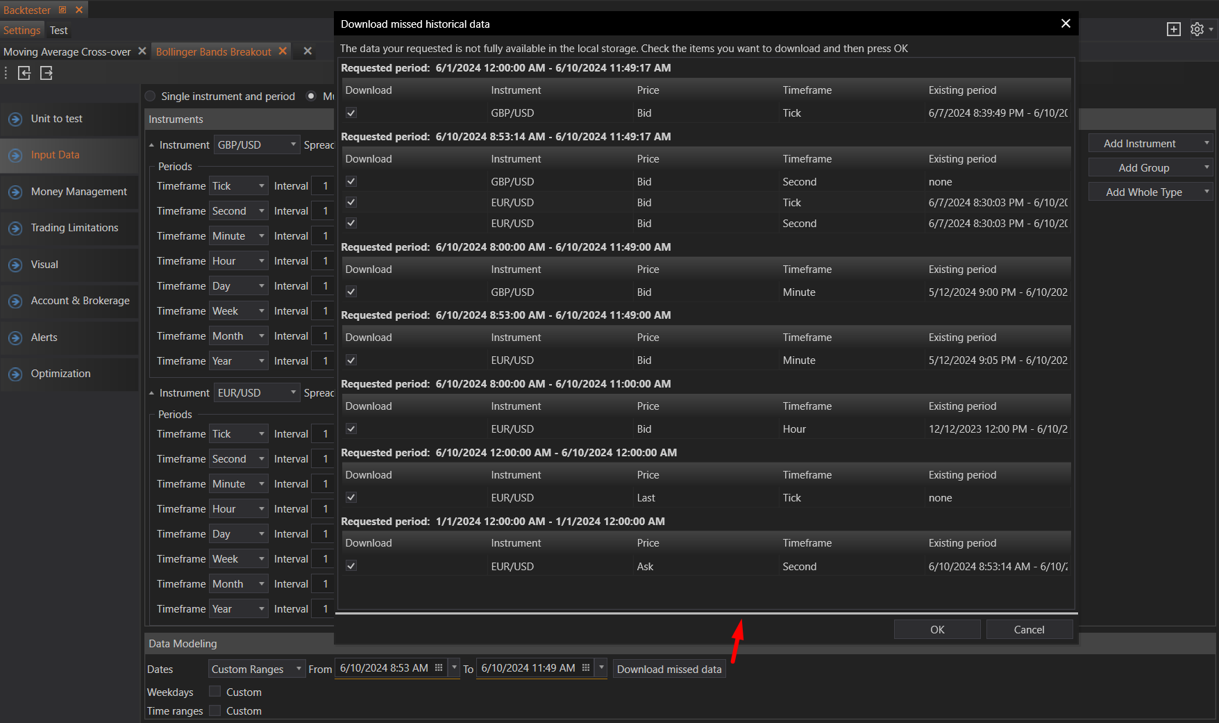 To ensure a comprehensive backtest, all necessary historical data must be available. If data is missing, users can download it directly through the backtester interface: