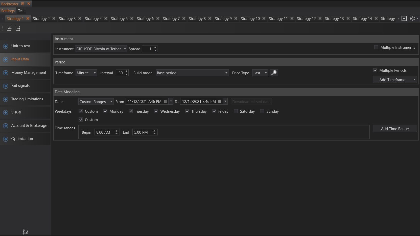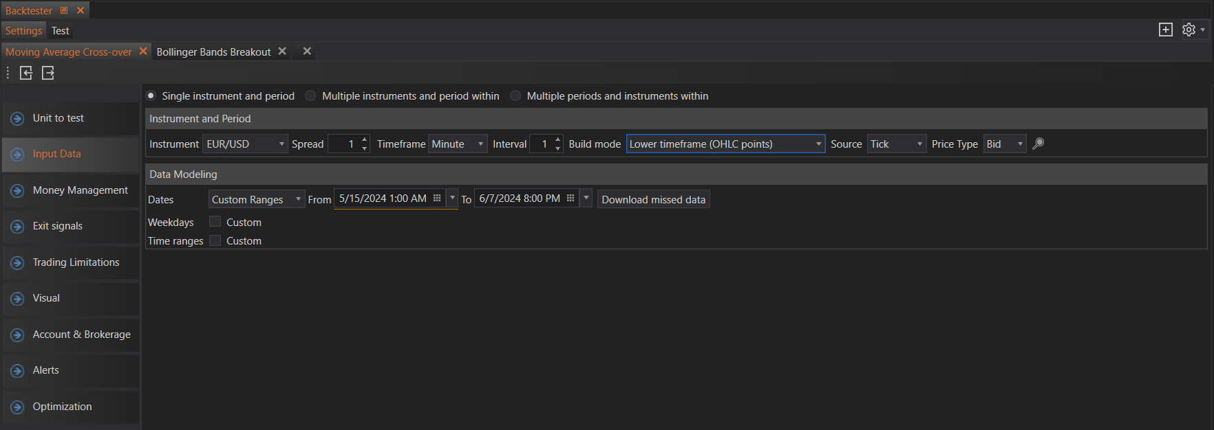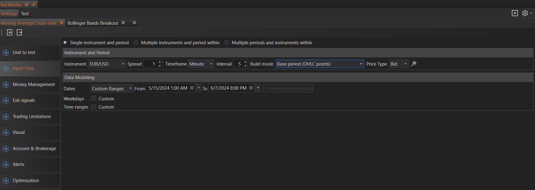In the Input Data tab, users need to define the instruments and periods that the strategy bot will run on. The Backtester supports running the algorithm on multiple instruments and periods, providing flexibility and comprehensive analysis.