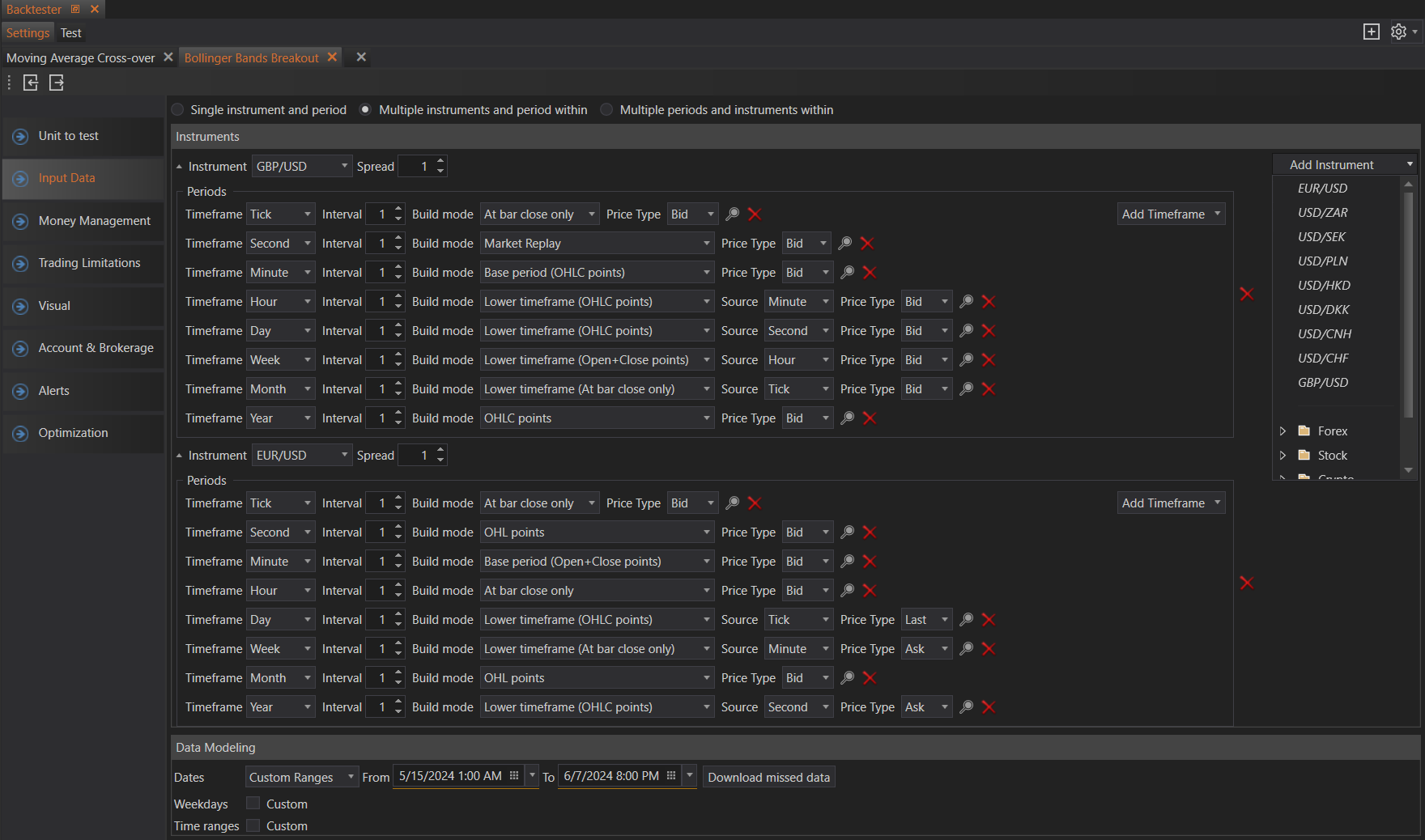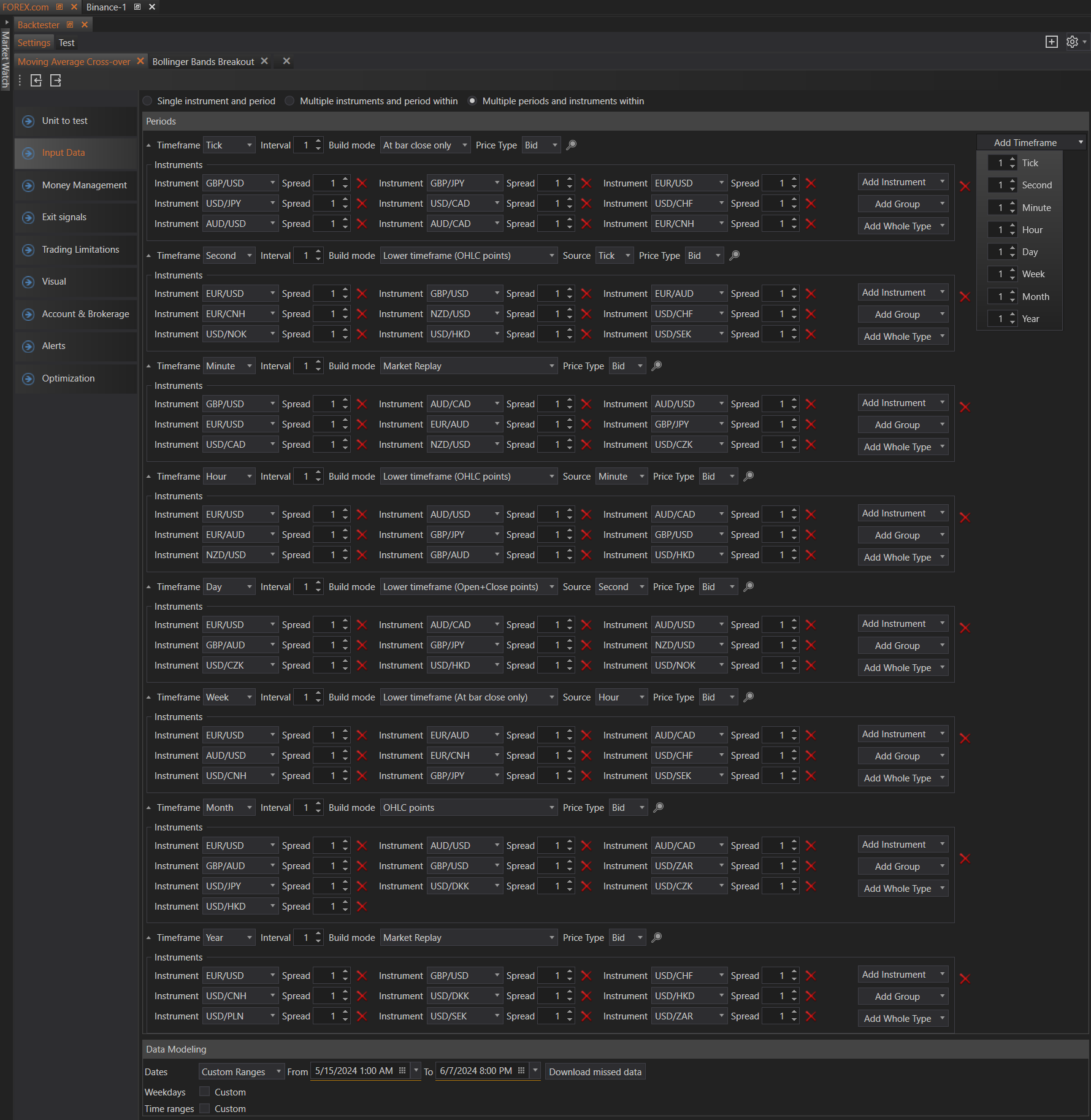 To use this option, first add an instrument, such as EURUSD. Then, set various timeframes for that instrument, such as 5 minutes, 1 hour, and 1 day, to test its performance across these intervals.