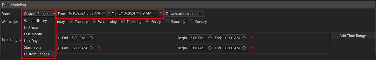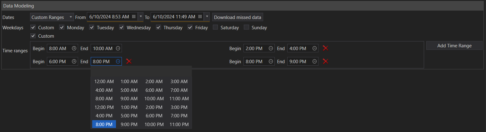 In addition to selecting specific days, users can also define the time ranges within each day to include in the backtest. This feature is useful for strategies that are sensitive to certain trading hours: