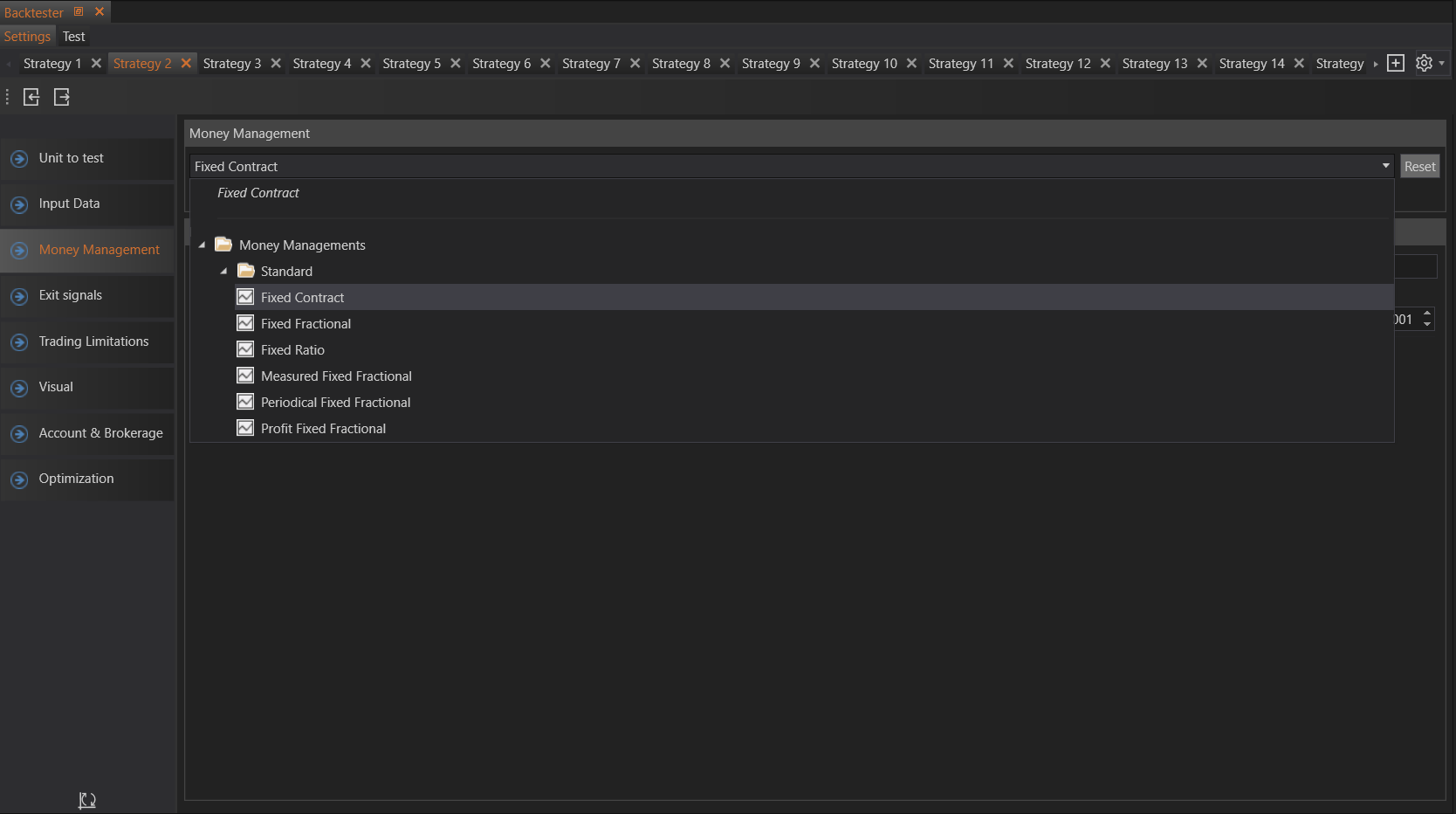 In the Backtester module of our application, each strategy requires a money management method to determine the quantity used to open trades. Users can choose from various position sizing methods to adjust their risk effectively.