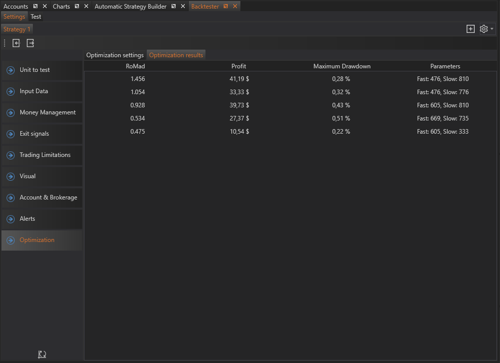 By utilizing the Optimization Results tab effectively, users can make informed decisions about which parameter sets to implement in their trading strategies. This ensures that the strategies are optimized for maximum performance, balancing profitability and risk.