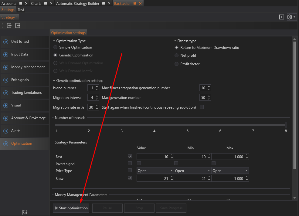 - Money Management Parameters: Similar to strategy parameters, these are all the money management parameters available for optimization. Users can define value ranges to find the best money management settings.