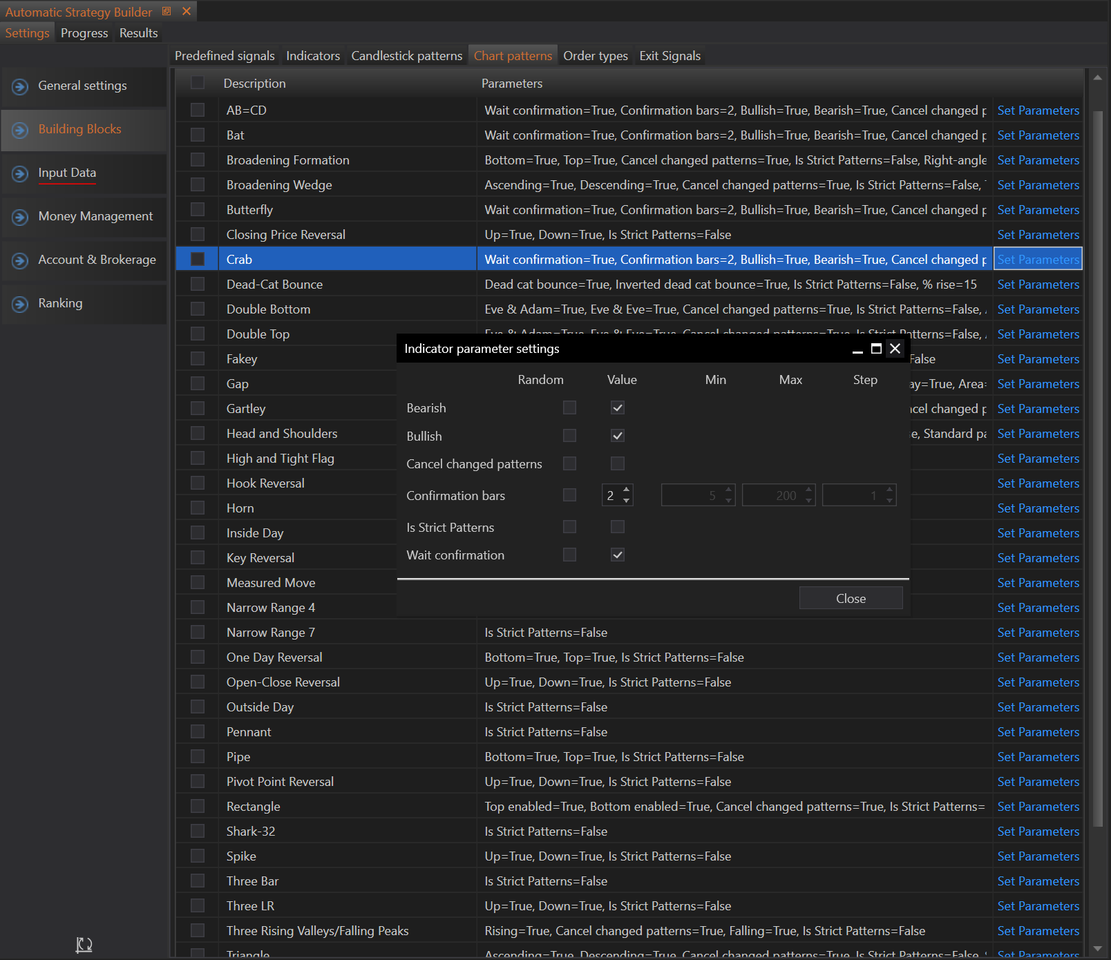 To use chart patterns in the strategy builder: