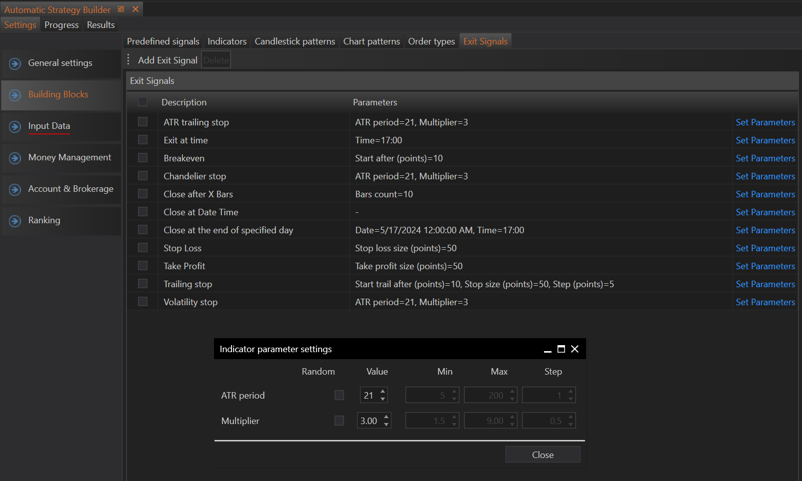 Suppose a user wants to add an ATR Trailing Stop as an exit signal and configure its parameters: