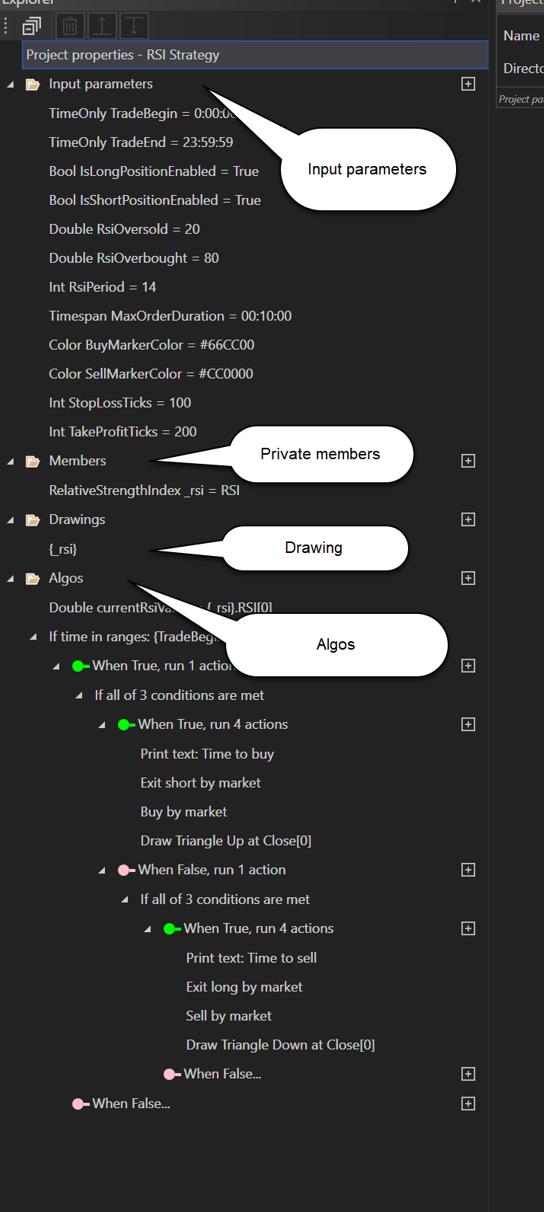 - Algorithm Blocks: Algorithm blocks are structured in a hierarchical tree format. Each strategy begins with one or more root blocks, each leading to subsequent blocks. This chain continues, expanding into a comprehensive set of operations as dictated by the strategy’s logic.
