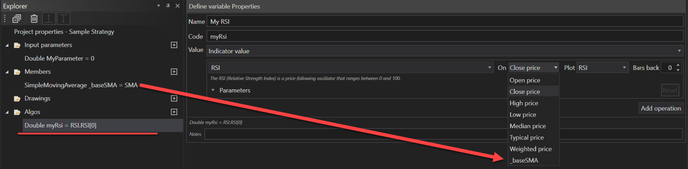 Operands can also be defined by referencing other values, such as input parameters, members, or local variables. This method is useful for creating dynamic relationships between different elements of the strategy. For example, an operand can be linked to an input parameter or a member, allowing for flexible and adaptable strategy components.