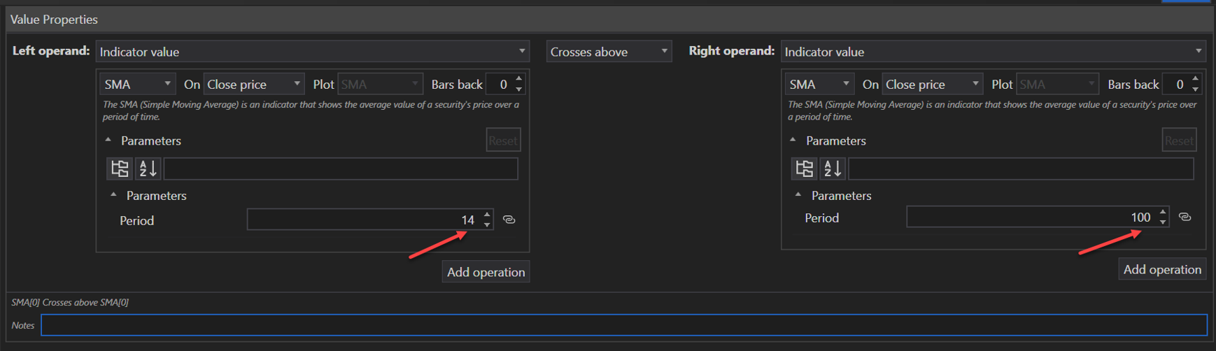 - Condition: Fast SMA crosses above Slow SMA