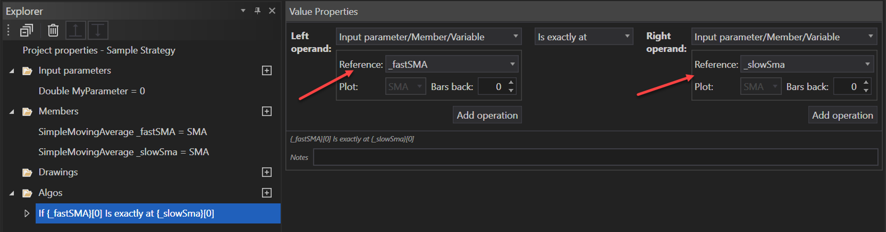 - Use the condition algo element to check if the fast MA member crosses the slow MA member upwards.