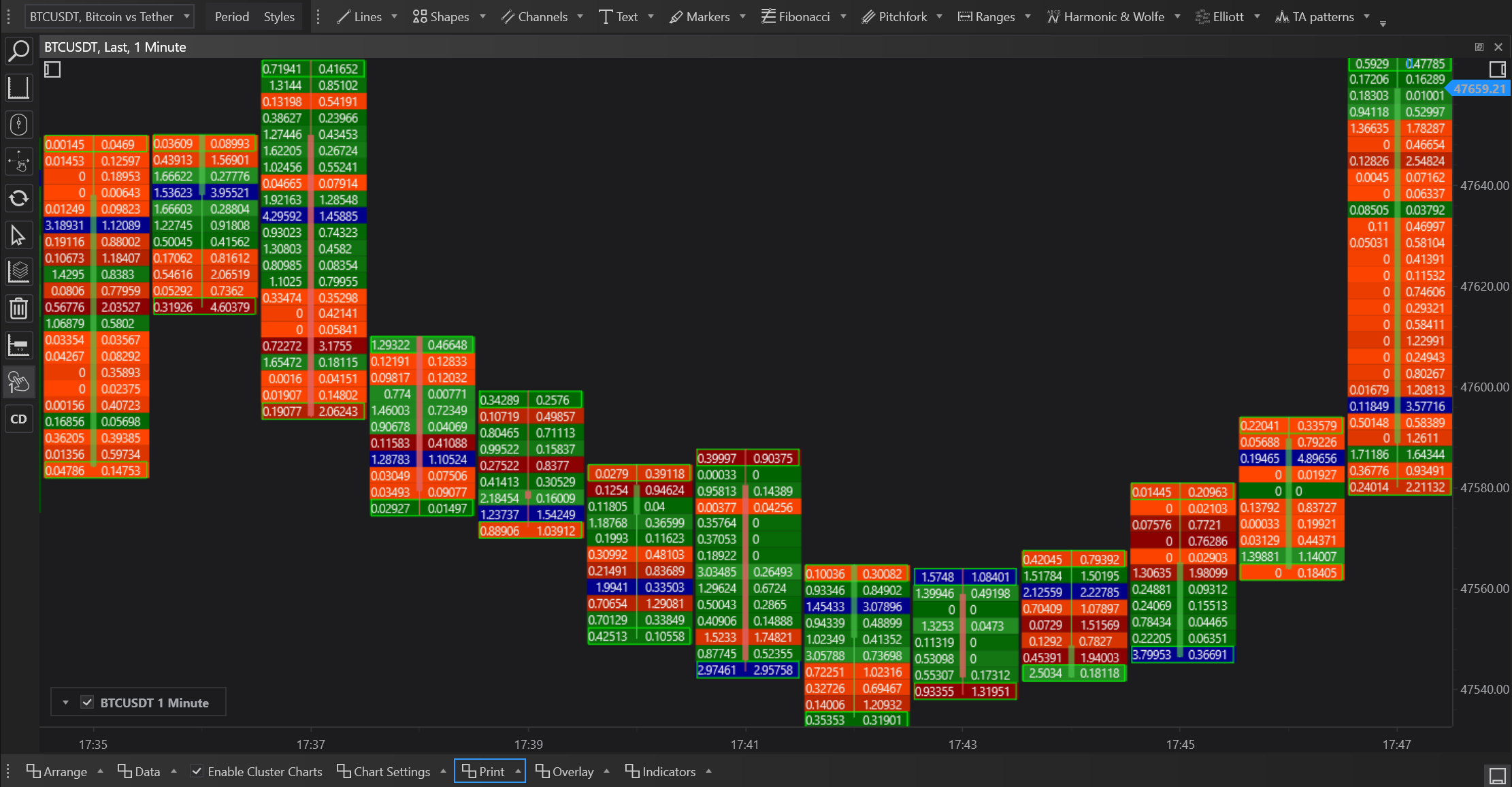 - Volume Visualization: Each cell in the chart represents the volume traded at a specific price level during a particular time interval.