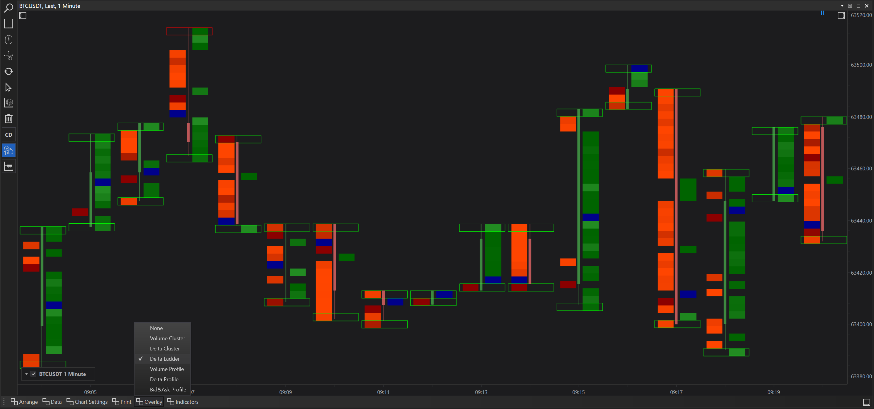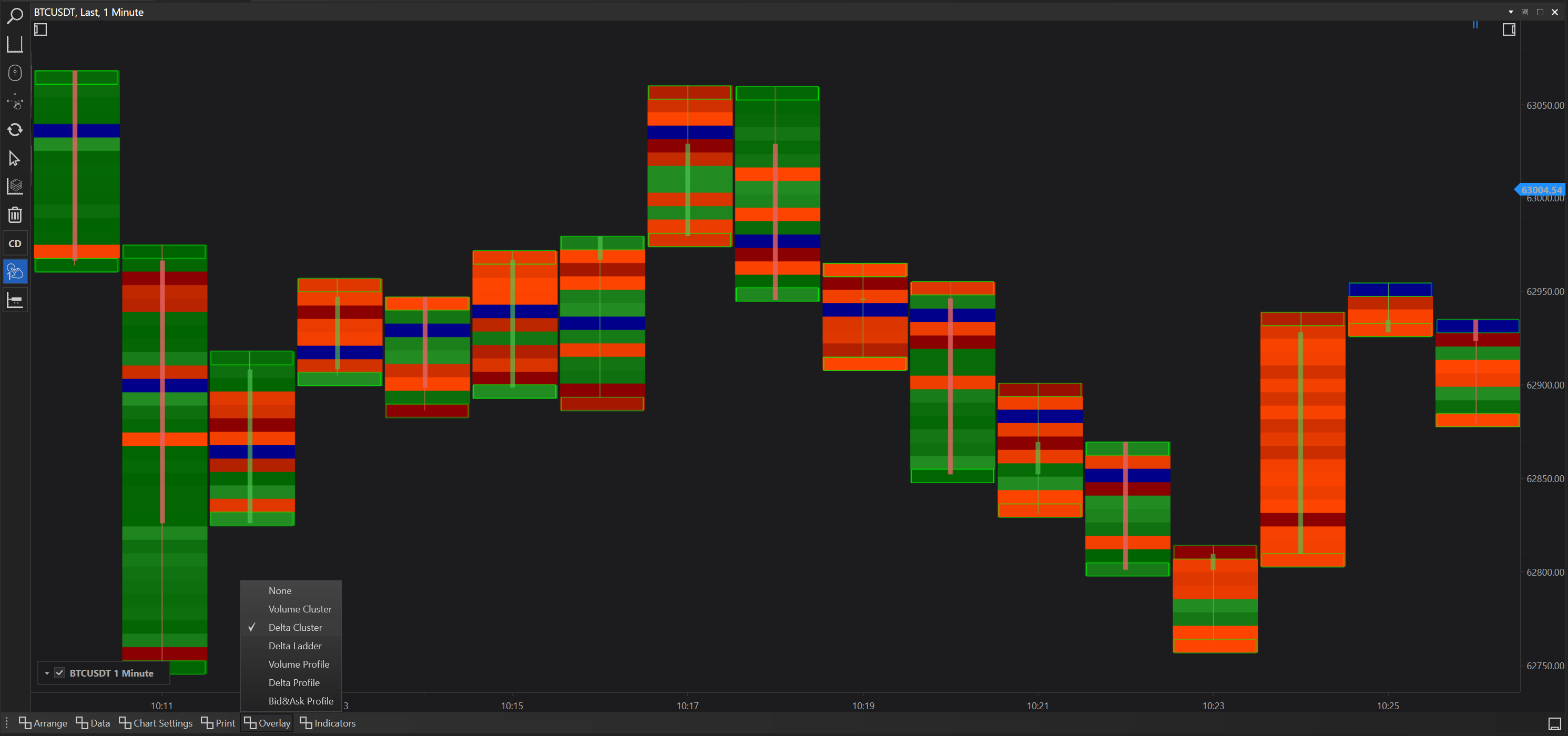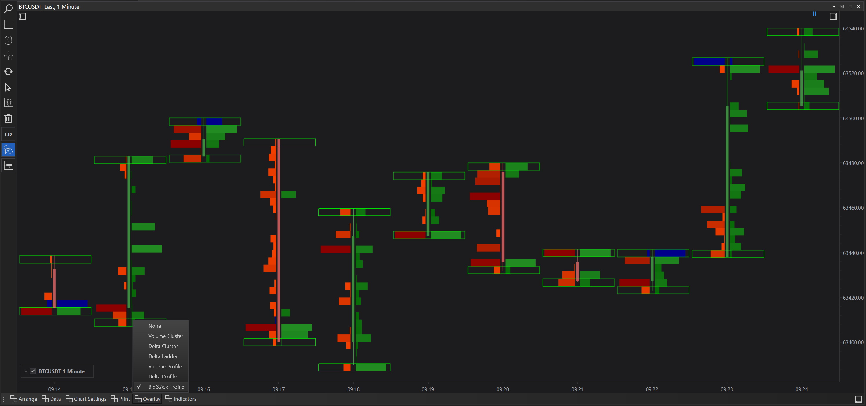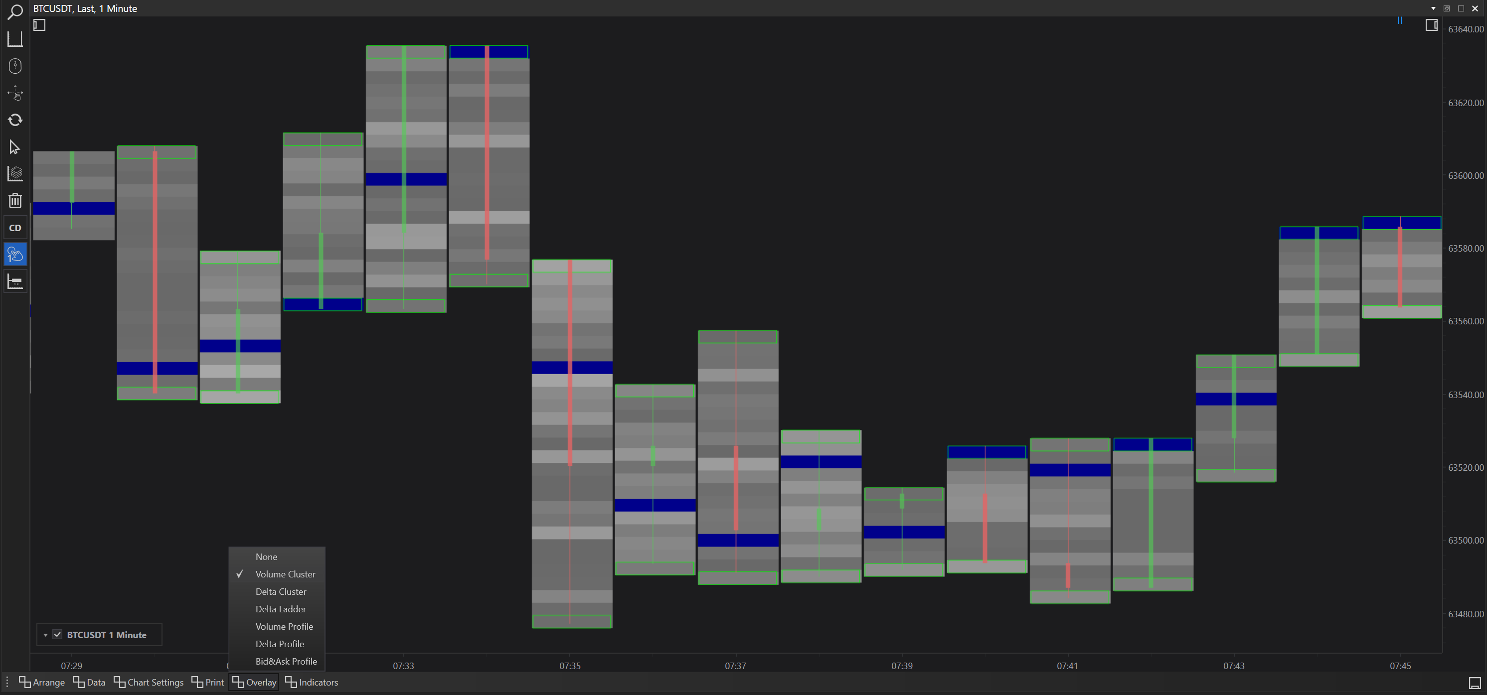 FinStudio's Cluster Charts not only provide detailed data prints on each candle but also allow for the overlay of various analytical tools to enhance market visualization and depth analysis. These overlays help traders to interpret market behavior more effectively by adding layers of data over the basic price action displayed by the candle bar charts. Here, we detail each overlay option available and its applications in trading.