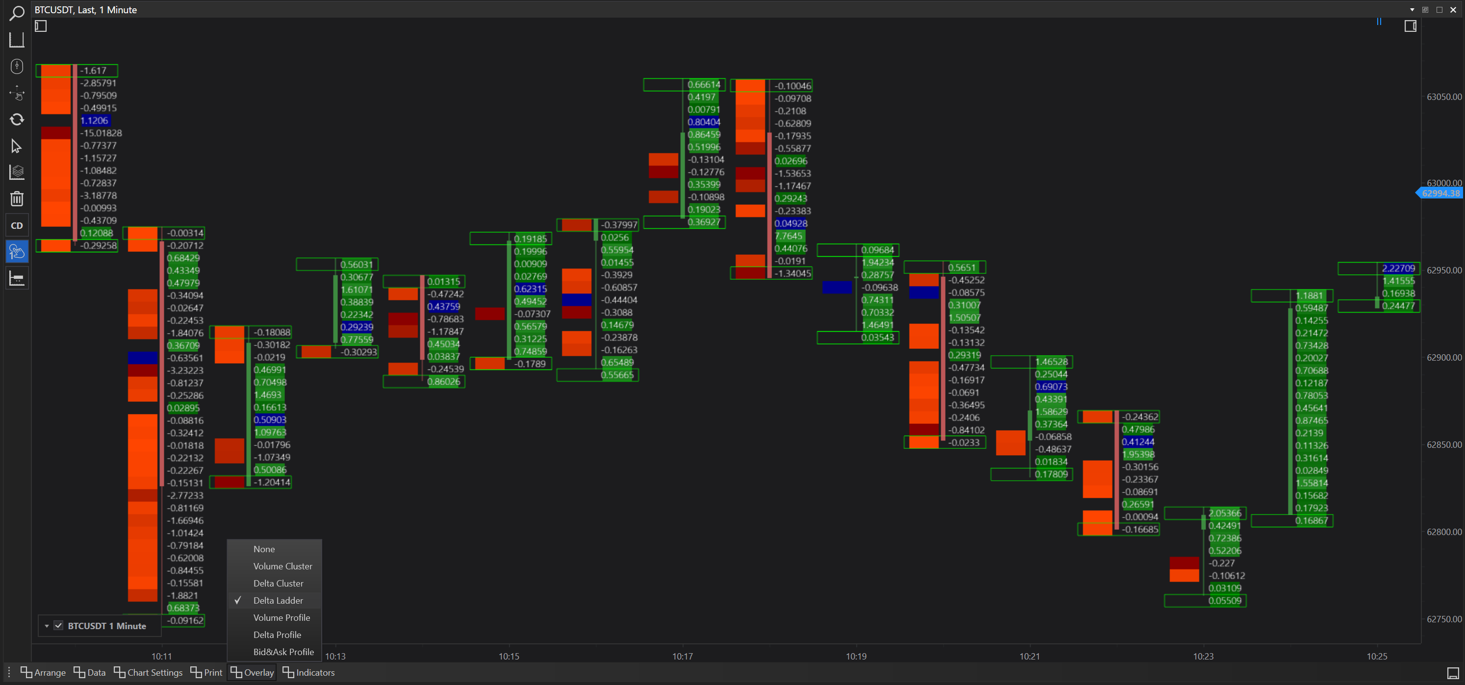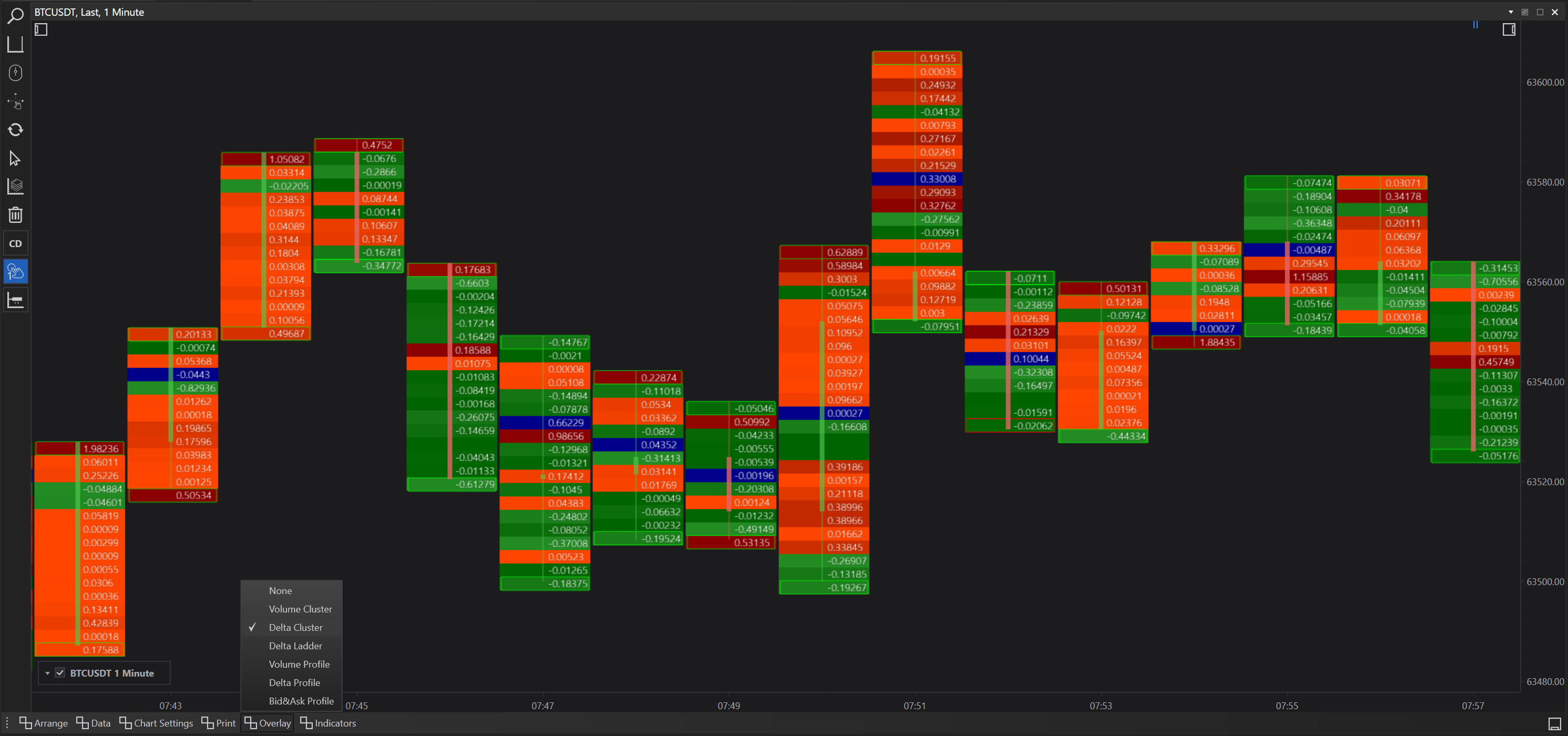 Delta Print with Delta Cluster Overlay: Highlights areas with significant buy or sell pressure by clustering delta values, useful for spotting potential reversal points.