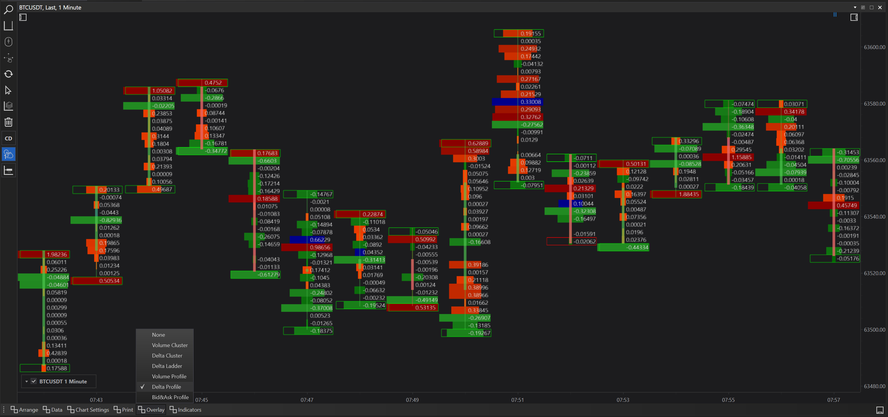 Delta Print with Delta Profile Overlay: Combines delta data with its profile, enriching the analysis of net market buying or selling pressure across different price levels.