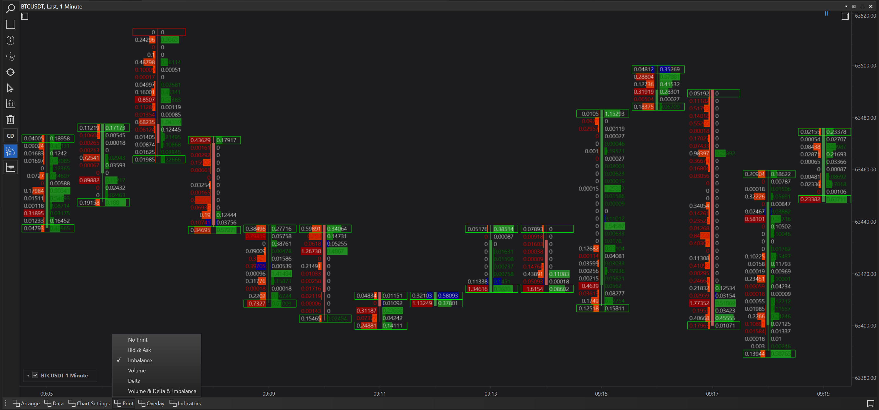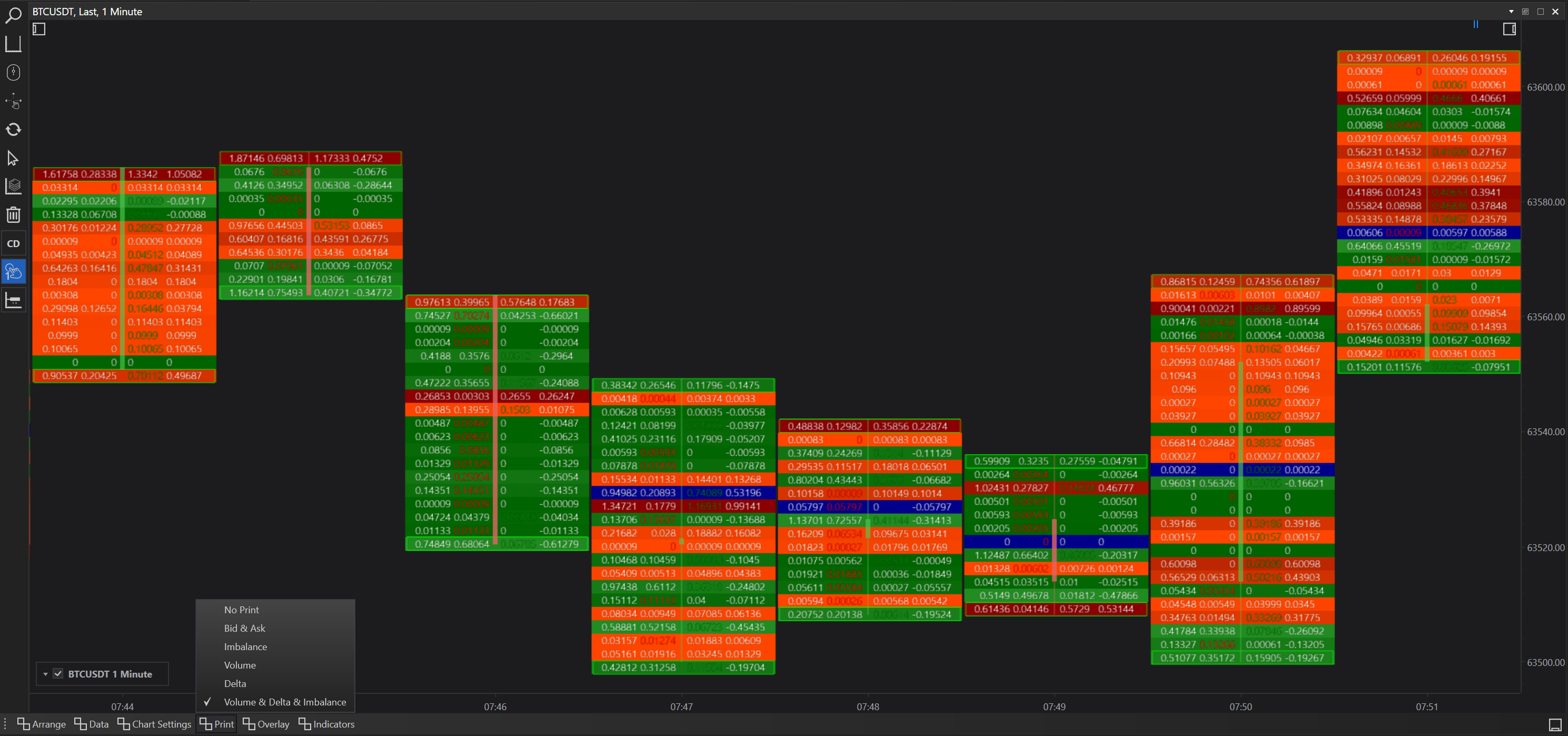 Volume, Delta, Imbalance Print with Delta Cluster Overlay: Offers a comprehensive look at volume, market direction, and imbalances, further detailed by clustering deltas for depth analysis.