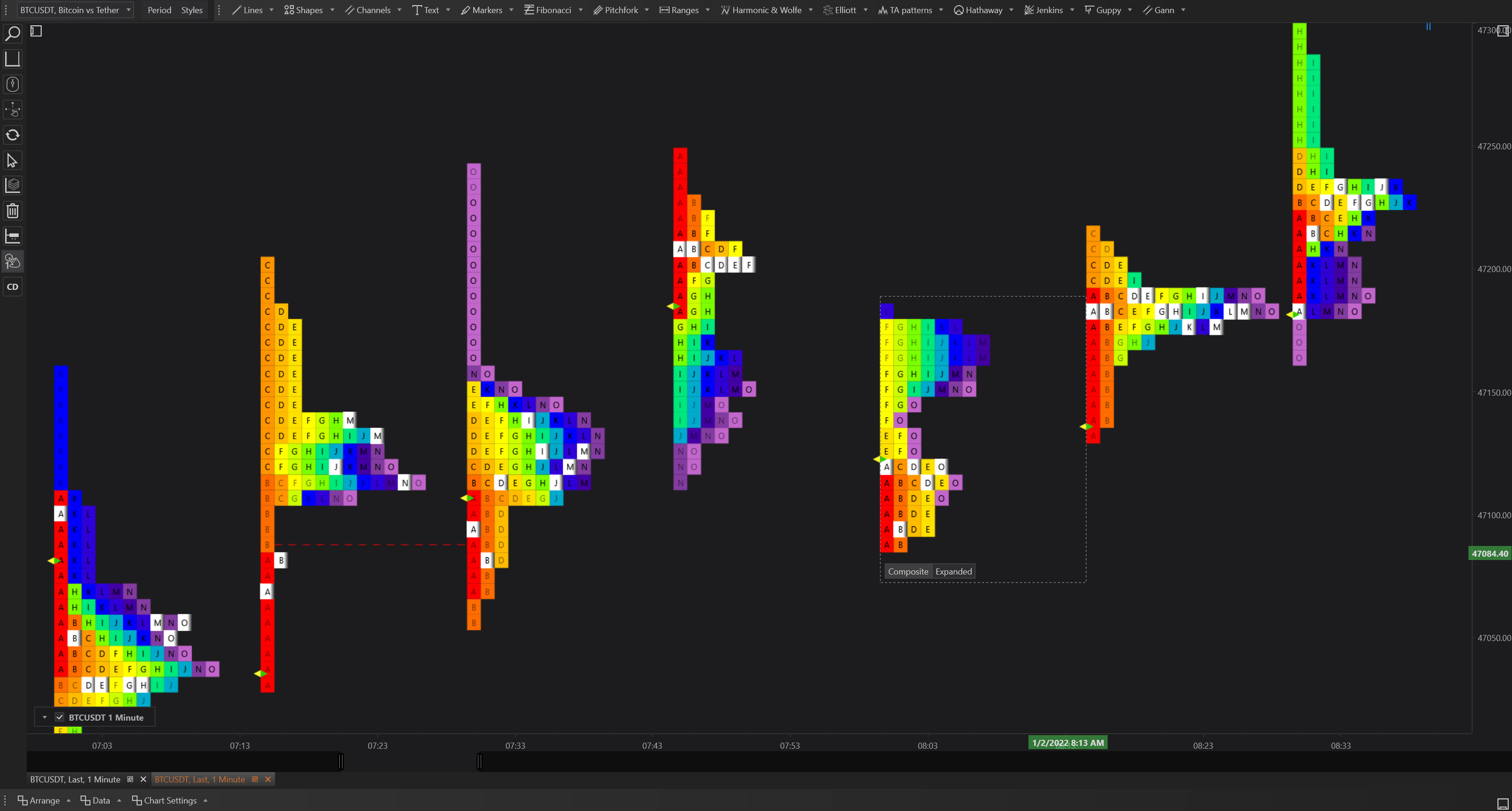 In contrast, the Expanded Market Profile view presents data as an aggregated volume profile but still incorporates the small letter boxes within each price level. This method aggregates all trades and volumes into a continuous graphical representation, making it easier to identify where the majority of trading activity occurred over the selected period.