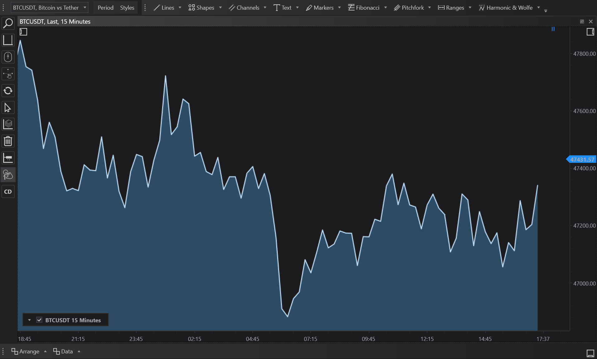 The Mountain chart style, while not as ancient as candlestick charting, has been a staple in financial visualization due to its straightforward and impactful display method. It derives from line charts but adds a filled graphical representation to better illustrate the volume and progression of price changes over time, enhancing the visual impact and ease of analysis.