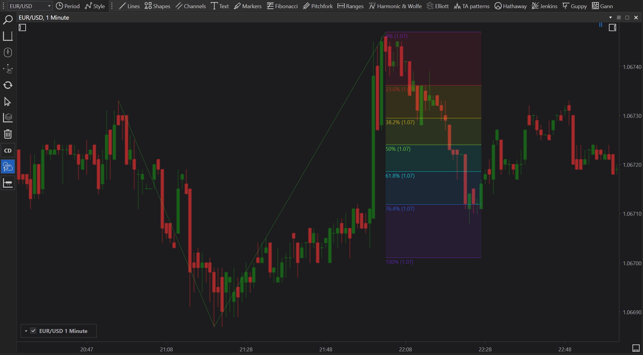 - Extend the Tool: Finally, drag the tool to the retracement low or high to project the Fibonacci extension levels into future price action.