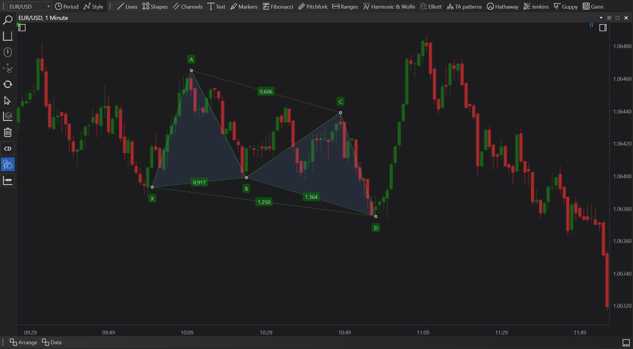 - Initial Placement: Click on the chart where you identify the start of a significant price movement, which serves as the X point of the pattern.