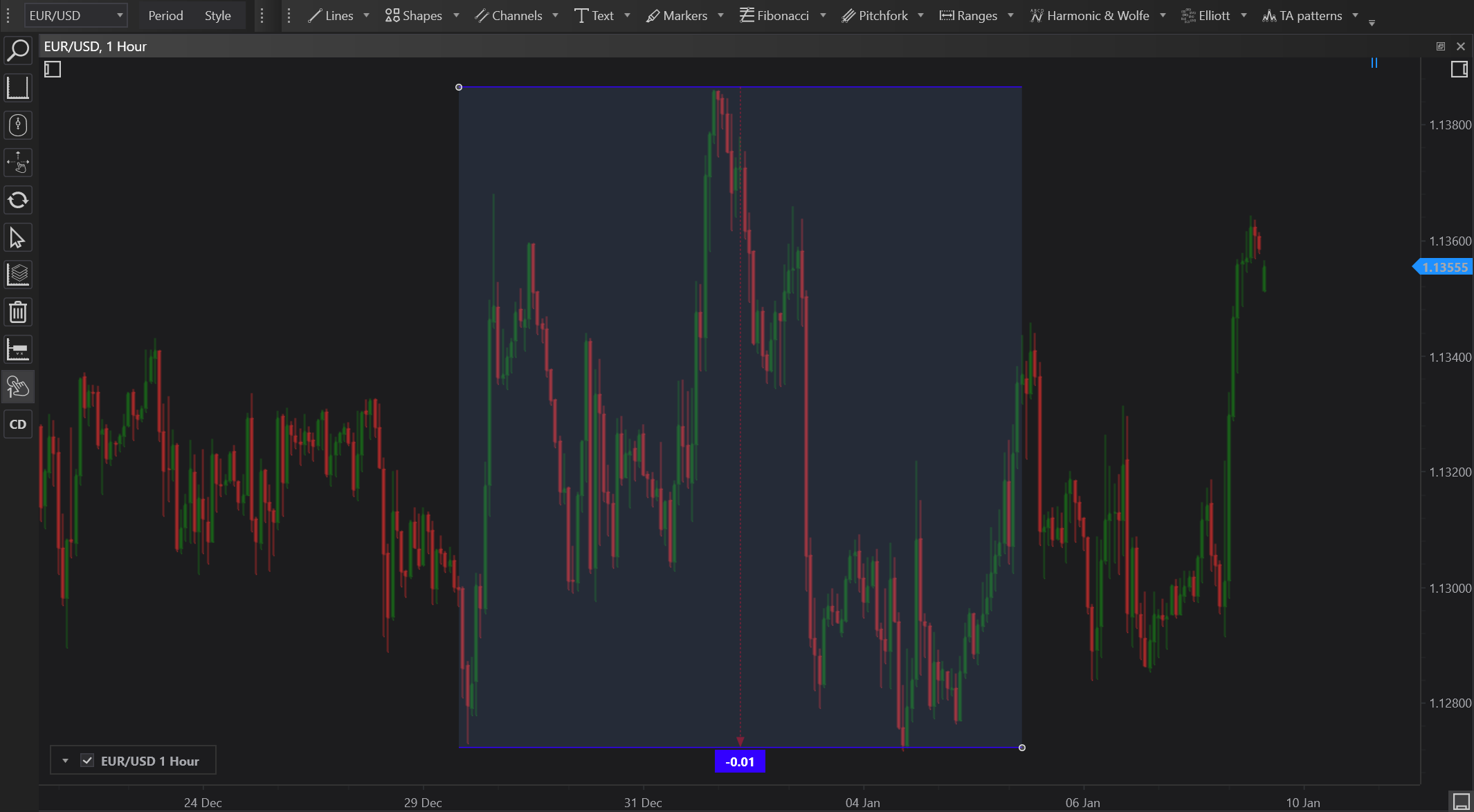 • Customizable Display: Users can customize the display settings such as color and line style to differentiate the Price Range tool from other annotations on the chart.