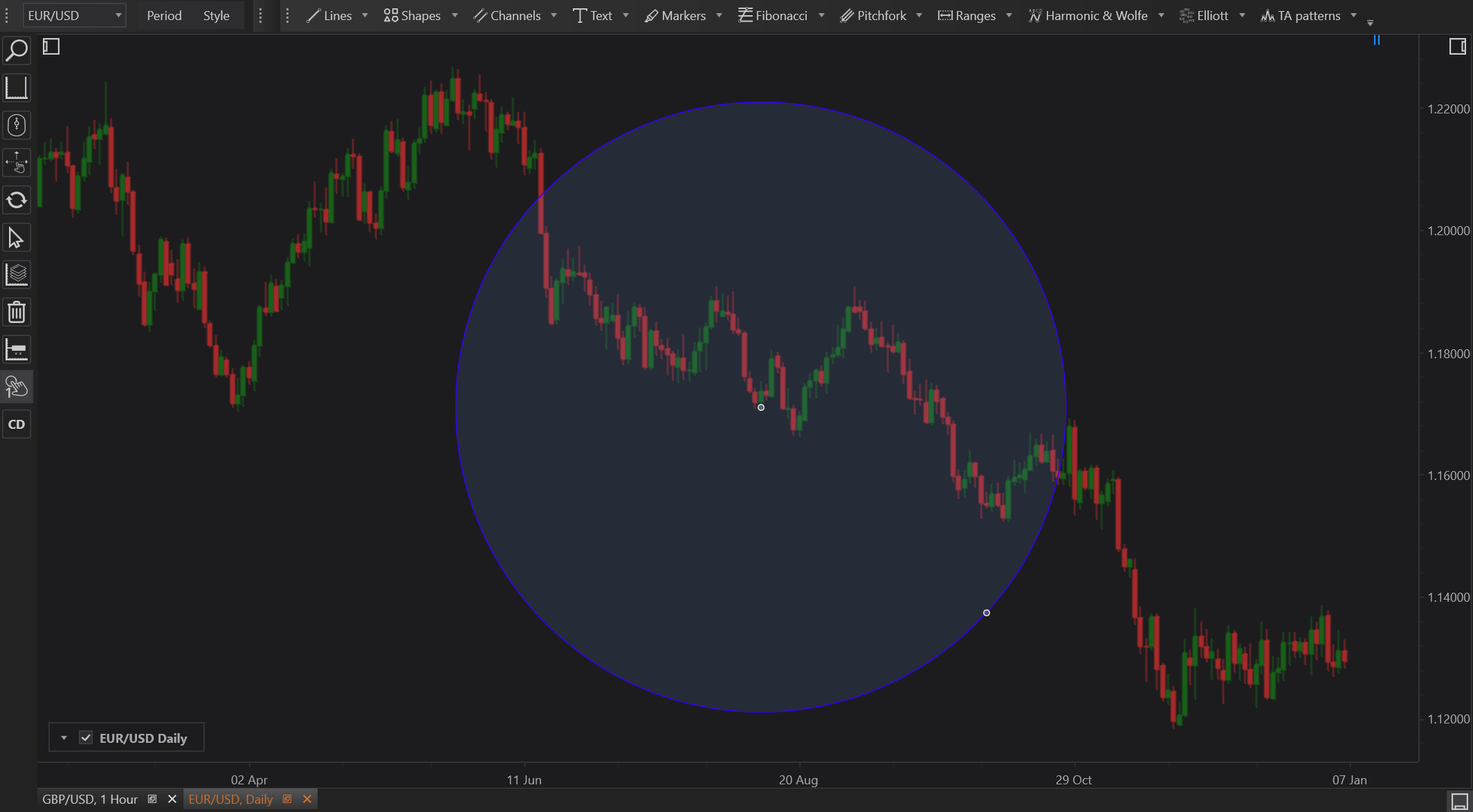 - Draw the Circle: Click and drag on the chart to draw a circle. The initial click defines the center of the circle, and dragging outwards sets the radius.