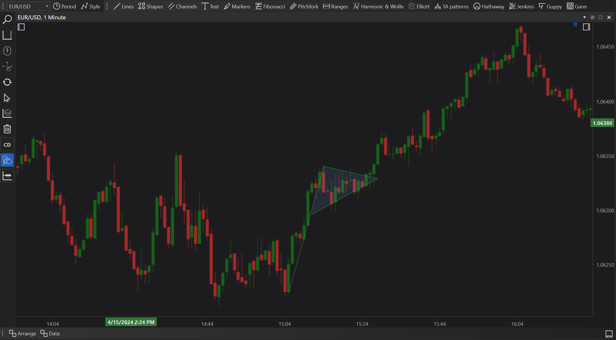 The Pennant pattern is a powerful continuation pattern in technical analysis, typically observed in fast-moving markets after a significant price movement. In FinStudio, the Pennant drawing tool is specifically engineered to help traders identify this pattern, signaling short consolidations followed by a likely continuation of the initial trend.