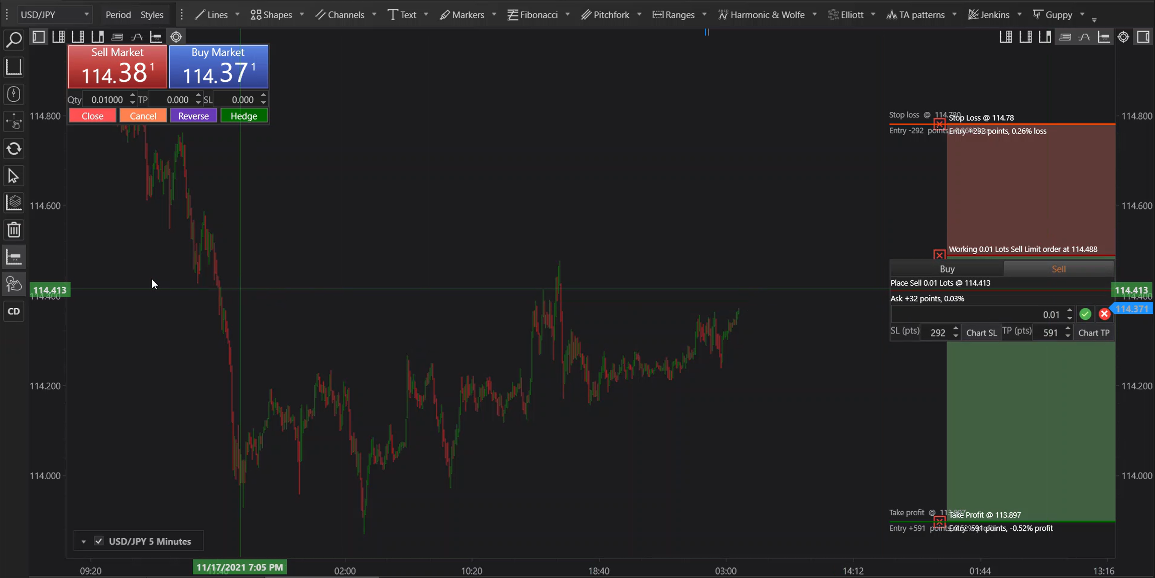 - Visual Placement: Alternatively, SL and TP can be set visually via the Chart SL/Chart TP buttons. By clicking these buttons and then clicking on the desired price level on the chart, SL and TP are set based on visual cues, enhancing the user's interaction with market dynamics.