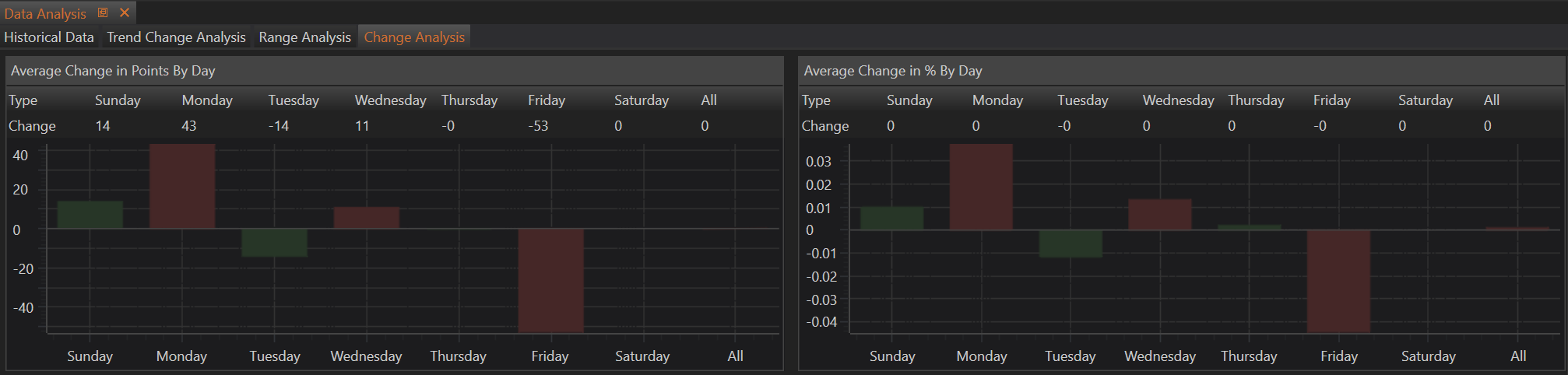 - Utility: This metric helps traders identify which days of the week typically experience the most significant movements, assisting in planning when to trade or avoid the market based on historical volatility and directional trends.