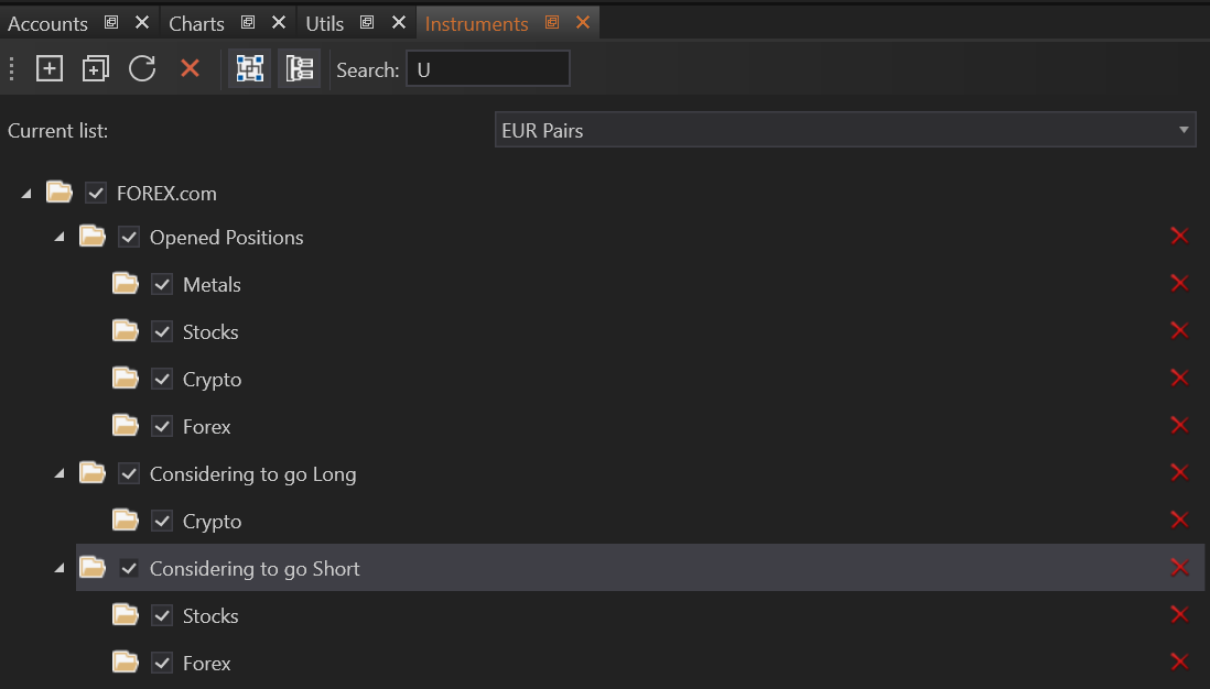 This level of customization allows users to design their instrument lists and groups with virtually no restrictions, limited only by their creativity. For instance, users can assemble an instrument list that includes various custom groups tailored to their specific analytical or trading needs.
