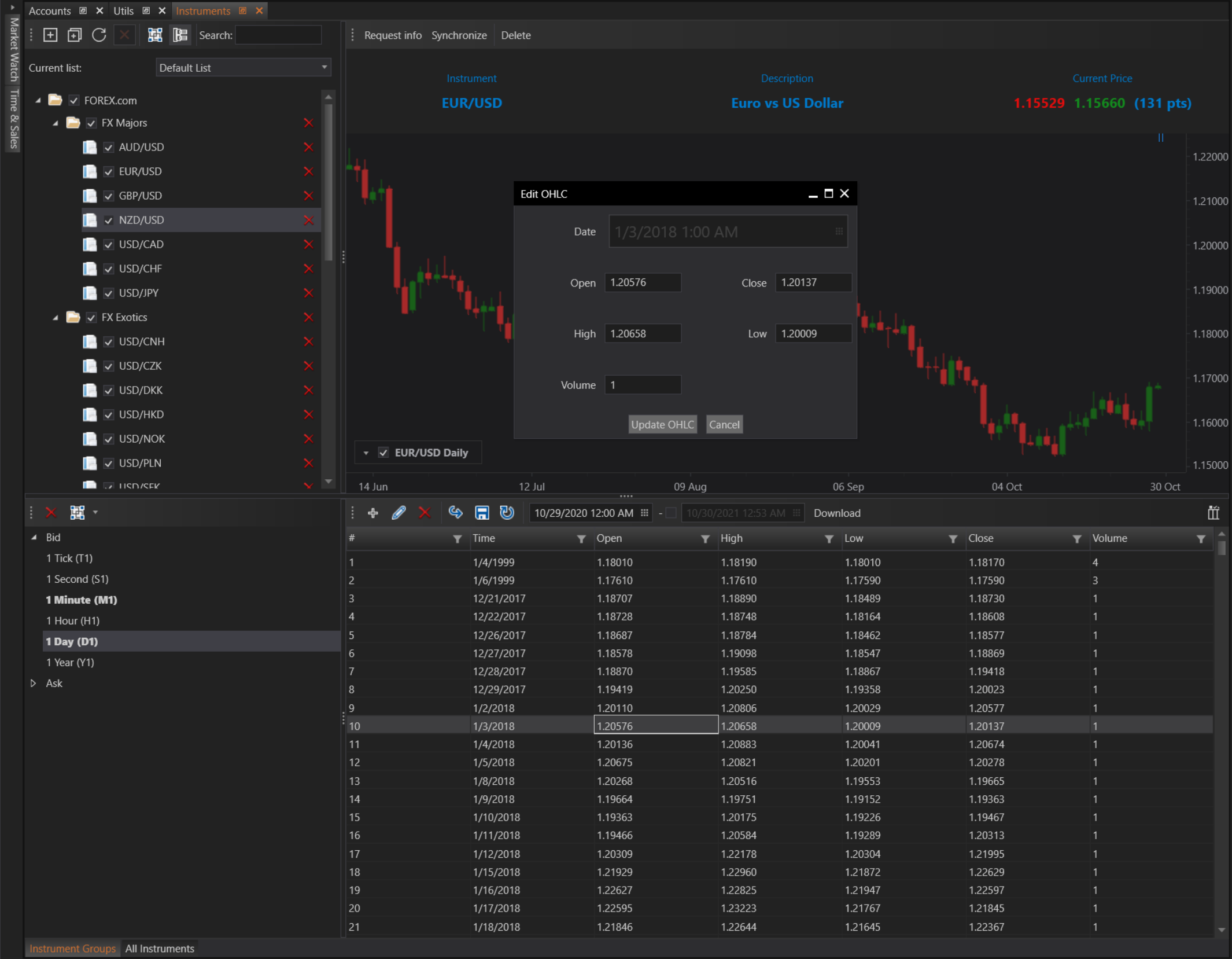 - Edit Records: Directly modify the data fields such as open, high, low, close, and volume within the grid.