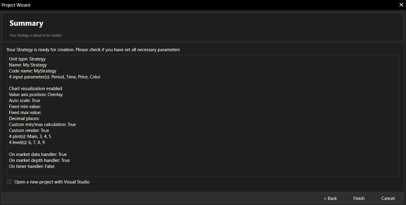 The Summary step provides a final overview of all the settings configured for the strategy. It allows users to review their choices before the strategy is created. There is also an option to open the project in Visual Studio.
