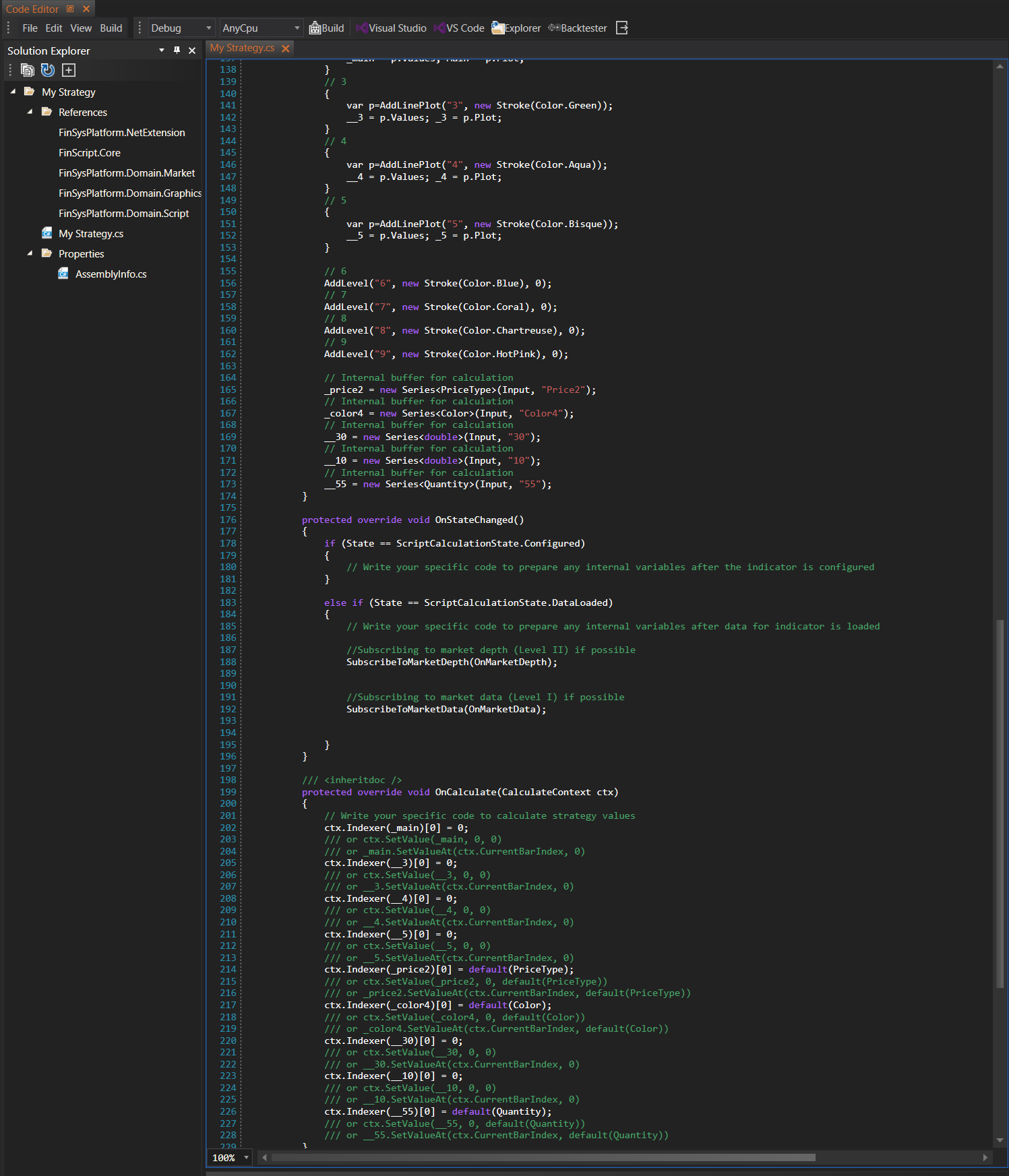 After completing the wizard, the code for the strategy is generated and can be edited in the Code Editor. Developers can add custom logic or make further adjustments to the generated code.