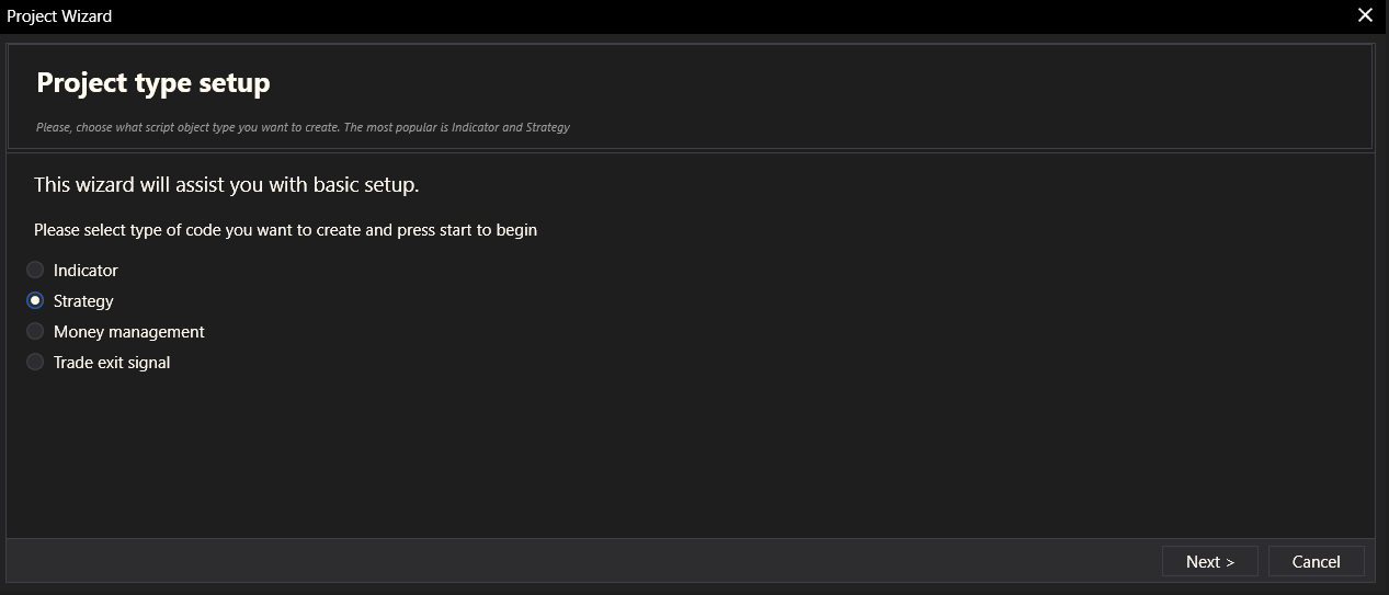 The Strategy Wizard in the Code Editor module allows users to create a trading strategy through a series of guided steps. Each step helps configure different parts of the strategy, and upon completion, the wizard automatically generates the corresponding code.