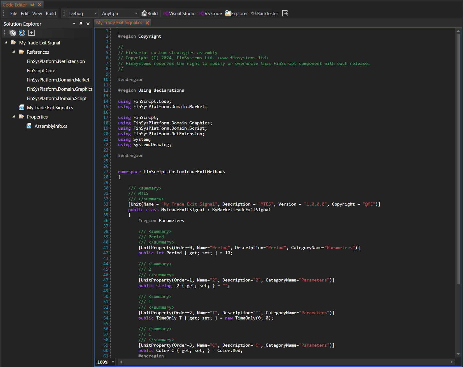 After completing the wizard, the code for the trade exit signal is generated and can be edited in the Code Editor. Developers can add custom logic or make further adjustments to the generated code.