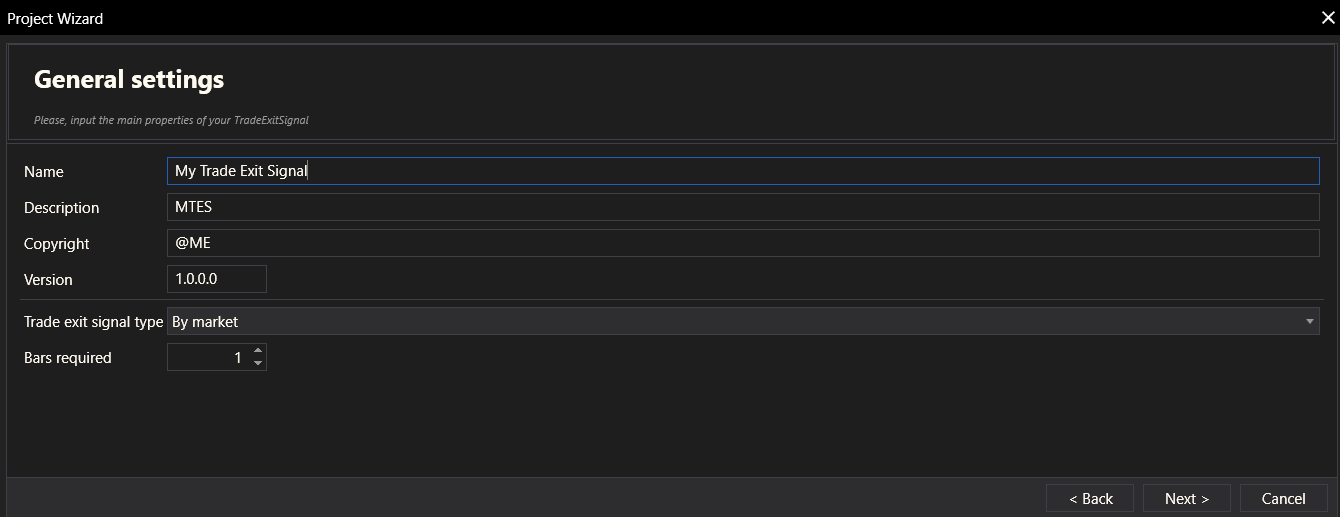 In the General Settings step, the user inputs the basic properties of the trade exit signal: