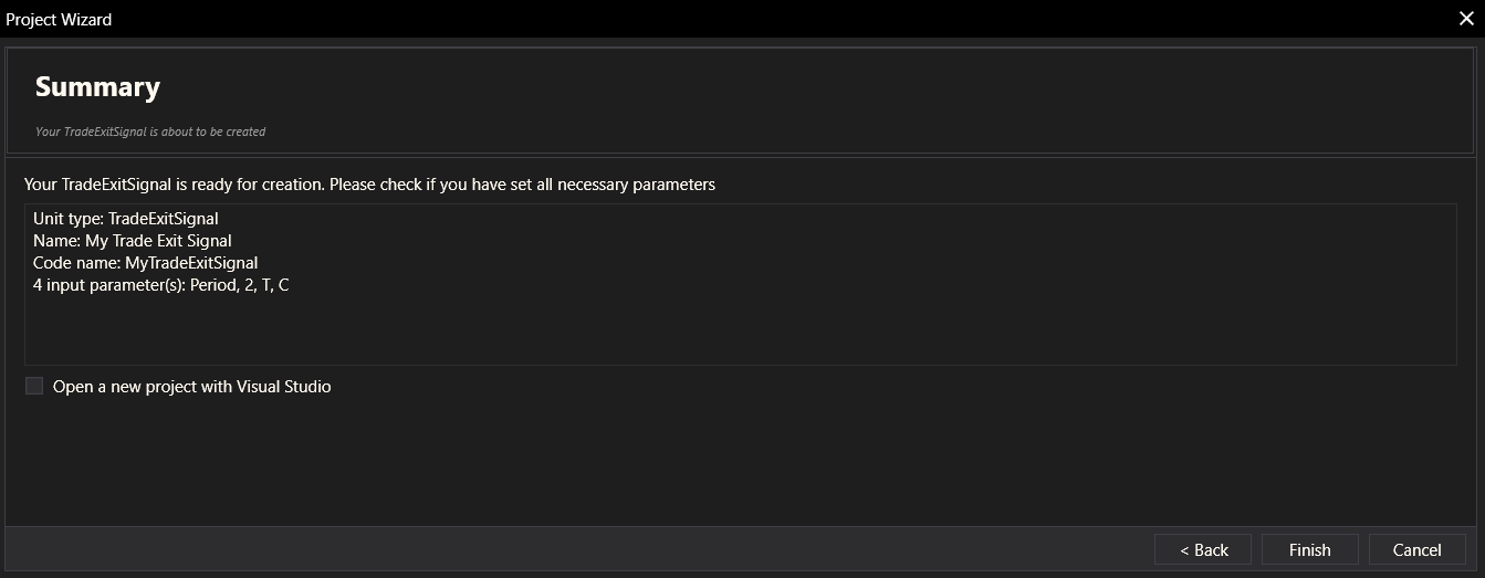 The Summary step provides a final overview of all the settings configured for the trade exit signal. It allows users to review their choices before the signal is created. There is also an option to open the project in Visual Studio.