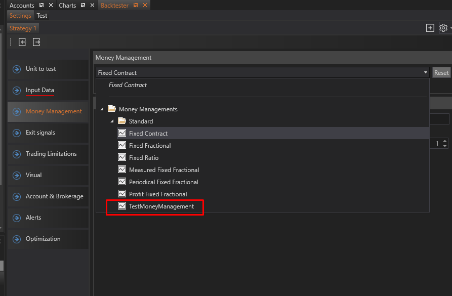 Developed money managent model can be used as a parameter for the strategy on a chart or in backtester.Â