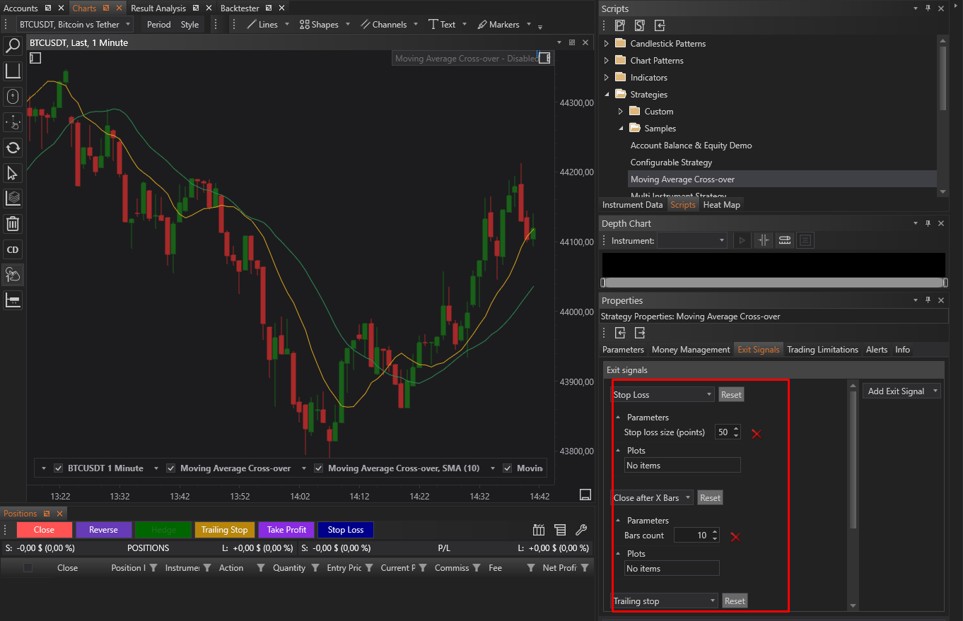 Developed exit signal models can be used as strategy parameters in Strategy Runner and Backtester as a part of exit signal collection.