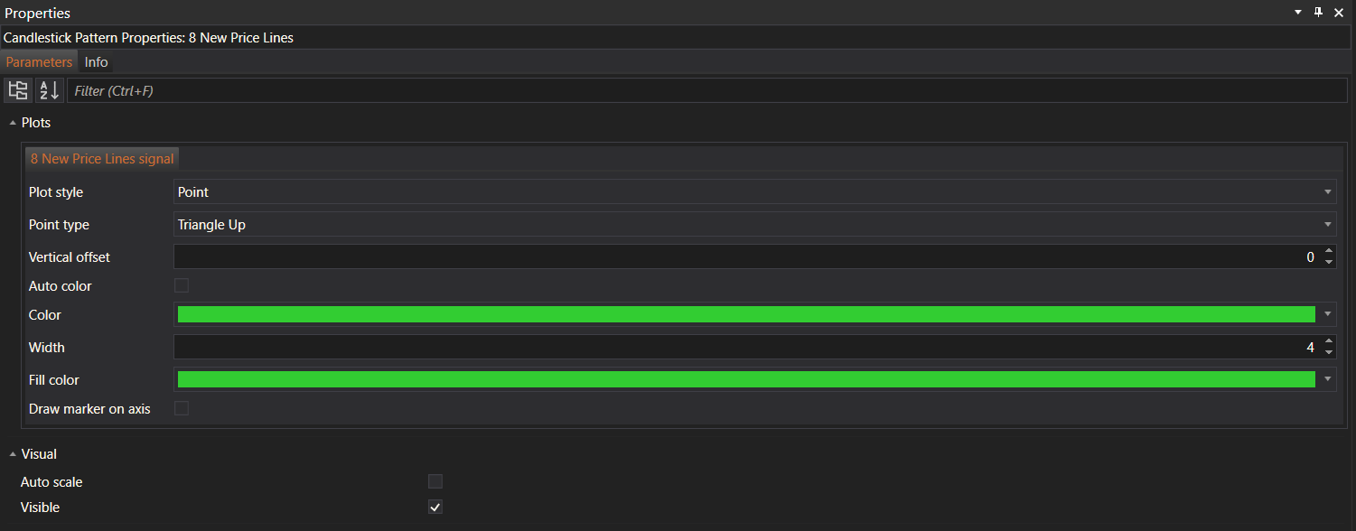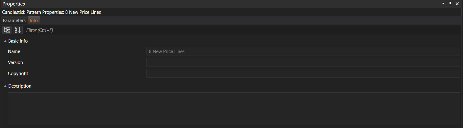 The Properties page for Candlestick Patterns in the Scripts module allows users to fine-tune the settings of their candlestick pattern scripts. The Parameters tab provides control over the visual representation and functionality, while the Info tab holds essential metadata about the script. By adjusting these properties, users can customize their candlestick patterns to better suit their trading strategies and preferences.