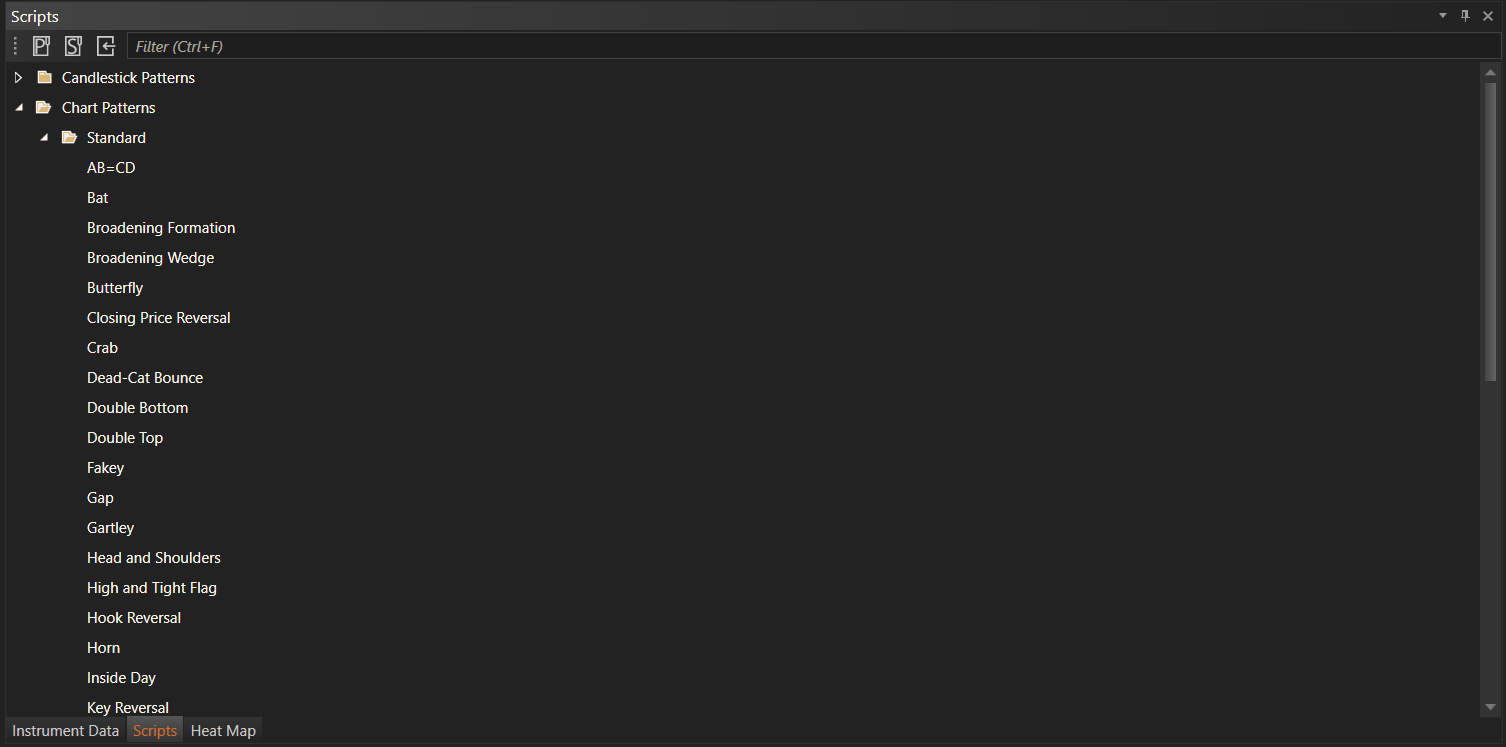 The Chart Patterns script type in the Scripts module allows users to identify and utilize various chart patterns in their trading strategies. These scripts are essential for traders who rely on technical analysis to make informed trading decisions.