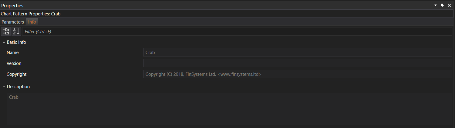 The Info tab provides basic information about the chart pattern script, such as its name, version, copyright, and a description.